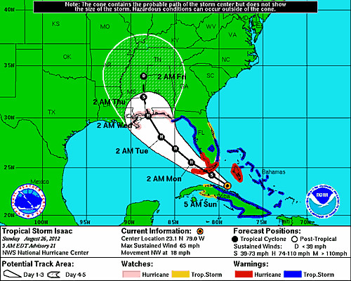 Ce matin à 6h00 le Centre national de météorologie (CNM) informe qu'ISAAC continue plus rapidement sa trajectoire Nord-Est sur Cuba. Son centre n'a donc pour l'instant aucun effet direct sur Haïti et la République Dominicaine. Toutefois il indique que de fortes pluies, des coups de vent et orages forts associés à des masses nuageuses convectives, intenses et dangereuses formant la bande périphérique de la tempête sont cependant toujours possibles à l'échelle du pays ce soir. Une amélioration de la situation est prévue pour demain matin. ISAAC est situé ce matin 6h00 à 23.1N 79.0W soit entre les Bahamas et Cuba, 344km à l'Est de la Havana, 275km au Sud-Ouest de Nassau, Bahamas, 322km au Sud-Est de Miami. Il se déplace à une vitesse de 30km/h en direction Nord-Ouest. Les vents maximum soufflent actuellement à 100km/h avec des rafales bien au-dessus, et la zone d'influence est de 335km autour de son centre. Le niveau rouge est maintenu en Haïti. Le SPGRD de concert avec la SEMANAH maintient toujours l'interdiction des activités maritimes sur toutes les côtes sud, Nord d'Haïti et le golfe de la Gonâve jusqu'à nouvel ordre. Le CNM de concert avec le SPGRD et la DPC demande à la population des zones à risques de rester vigilante et d'appliquer scrupuleusement les consignes de sécurité.