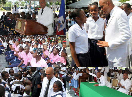 Le Président Michel Martelly, accompagné du Premier Ministre, M. Laurent Salvador Lamothe, a réuni, le mercredi 17 Octobre, au Palais National, des milliers d’écoliers provenant de certaines écoles publiques et non publiques du pays. A l’occasion de la commémoration du 206ème anniversaire de la mort de Jean-Jacques Dessalines, le Chef de l’État a voulu sensibiliser la jeunesse haïtienne sur sa vision politique consistant à offrir un mieux être à la population, en mettant l’accent sur le programme d’éducation gratuite et sur l’idéal Dessalinien. Discours du Président de la République : Lors de son intervention, M. Vanneur Pierre, le Ministre de l’Éducation Nationale et de la Formation Professionnelle (MENFP), a fait état de 10,114 écoles bénéficiaires du Programme de Scolarisation Universelle Gratuite et Obligatoire (PSUGO), soulignant que pour cette année académique, 68 établissements scolaires sont prêts à être inaugurés, plus de 500 autres sont en voie de réhabilitation et plus de 140 écoles fondamentales, sont en attente de construction.