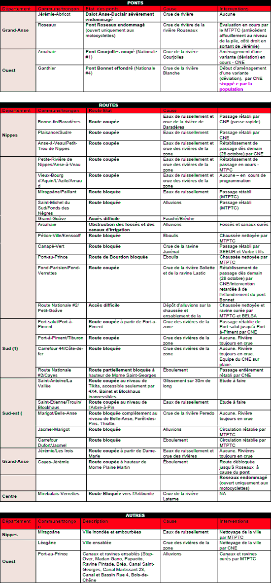 Samedi, le Premier Ministre, Laurent Lamothe, accompagné du Sénateur Steven Benoît, a effectué le survol du pays en hélicoptère, afin de mesurer l’ampleur des dégâts après la passage de Sandy. À son retour, le Premier Ministre a résumé la situation lors d’un point de presse à l’aéroport « [...]...nous avons commencé notre visite vers 11h30 ce matin, nous avons fait un survol de pratiquement toute la Côte Sud, nous sommes également passé dans le Sud-Est, sur la Vallée de Jacmel très bas, pour pouvoir constater les dégâts, nous avons survolé les Cayes, Côtes-de-Fer, Cavaillons, Aquin, nous sommes aussi passé sur Petit-Goâve, Grand-Goâve, Miragoâne [...] vous savez, il y a 200,000 personnes affectées qui vivent dans des conditions très difficile en raison des inondations, il y a beaucoup de jardins qui sont perdus [...] nous avons beaucoup de travail devant nous pour ce qui est de l'aide, que nous allons être obligé d'apporter durant les prochains, jours, semaines et mois à venir, ce ne sera pas une chose facile, parce qu'il y a beaucoup de routes et de pont coupés [voir le tableau au bas de la page] [...] nous avons constater aussi qu’il a beaucoup d'érosion [...]