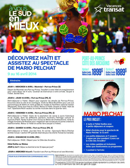 Signature of an agreement between Haiti and "Tourism Montreal" Thursday, Stéphanie Balmir Villedrouin, for the Ministry of Tourism, the Mayor of Montreal, Denis Coderre and Yves Lalumière the CEO of "Tourism Montreal", signed a Memorandum of Understanding for the implementation of activities for the development of Tourism in Haiti. Delegation of students from Wharton School, University of Pennsylvania On Thursday, the Minister Villedrouin hosted a student delegation from Wharton School, University of Pennsylvania led by Nohémie Sanon, of Haitian origin. Ms. Villedrouin took the opportunity to make the presentation of the progress of the tourism sector in Haiti. Mario Pelchat in show in Haiti Wednesday, Stéphanie Balmir Villedrouin, the Minister of Tourism met with the responsible for the performance agency Dream Promo, in this case the singer Luke Mervil and Hugline Jerome concerning the preparations for the show in Haiti of Mario Pelchat on April 12. This show will be included in the package "Your South" (À vous le Sud) offered by Air Transat in association with the Ministry of Tourism from 9 to 16 April. This Montreal / Port-au-Prince package includes 1 cocktail arrival, 4 nights at hotel Karibe 3 days on the Cote Arcadins and the show of Mario Pelchat.