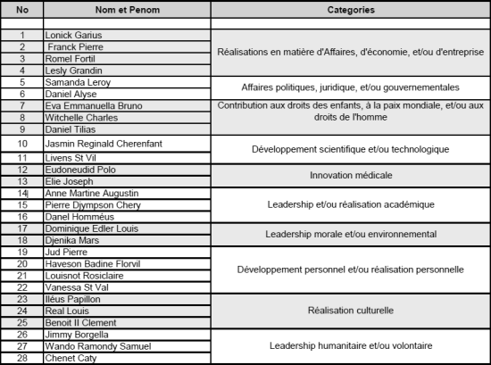 Junior Chamber International Haiti (JCI Haiti), with the support of the Embassy of Canada and its partners, publishes a list of 28 pre-selected youth of the 4th edition of the competition The Ten Outstanding Young Person, launched on August 29 https://www.haitilibre.com/en/news-11943-haiti-social-launch-of-the-competition-the-ten-outstanding-young-persons.html From the record of the 28 candidates, a panel of 3 people, will select 18 November 2014, the 10 winners 2014. Recall that the excellence competition TOYP (The Ten Outstanding Young Person) allows to formally recognize the talents of young people who excel in their fields of action and create positive change in the country. JCI Haiti, congratulated the hundreds of applicants, who have submitted their records, a proof that the young people who positively influence their community, are very numerous in Haiti. List of youth shortlisted :