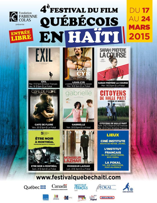 Locations and addresses of projections (Free admission): Institut Français d'Haïti (IFH) (99, rue Lamartinière, Bois-Verna) Fondation Connaissance et Liberté (FOKAL) (143, ave Christophe, Port-au-Prince) Ciné Institute (Route de Meyer, Jacmel) Selected films and projection locations : Tuesday, March 17: at 7h00 p.m. : « Exil » by Charles-Olivier Michaud (IFH) ; Wednesday 18 March: at 3h00 p.m. : "Louis Cyr, l'homme le plus fort du monde" (FOKAL) ; at 5h00 p.m. : "Sarah préfère la course" by Chloé Robichaud, nominated at the 2013 Cannes Film Festival (FOKAL) ; Thursday, March 19 at 5h00 p.m. "Exil" by Charles-Olivier Michaud (FOKAL). Friday, March 20: at 3h00 p.m. : "Café de Flore" de Jean-Marc Vallée (FOKAL) ; à 6h00 p.m. : "Gabrielle" de Louise Archambault (FOKAL) ; à 2h00 p.m : "Classe de Maïtre" (Ciné Institute, JACMEL). Saturday, March 21 and Tuesday, March 24: at 7h30 p.m. : "Citizens of Nowhere" by Nicolas-Alexandre Tremblay and Régis Coussot (Ciné Institute JACMEL) and Tuesday, March 24 at 7:00 p.m (IFH). he two screenings will be followed by a discussion with the filmmakers. Saturday, March 21: at 3h00 p.m. Succession and Diversity Program: "Être noir à Montréal" (FOKAL). Monday, March 23: at 3h00 p.m. "Monsieur Lazhar" by Philippe Falardeau (FOKAL). For descriptions of the films and see the trailers visit: www.festivalquebechaiti.com/films-et-horaire-2015.html Learn more about the Festival : The Quebec Film Festival in Haiti (FFQH), was created in 2009 by the Fabienne Colas Foundation, dedicated to education in the arts and promoting Cinema, Art and Culture, in collaboration with the Government of Quebec and the Canadian Embassy in Haiti. The aim of the Festival is to promote the cultural rapprochement between Quebec and Haiti, by presenting to Haitians the wealth of Quebec cinema at free screenings and open to all. This festival is part of a joint declaration on cultural cooperation between the governments of Quebec and Haiti. HL/ HaitiLibre