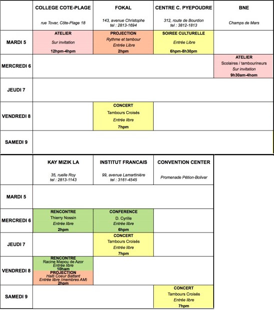 The 4th edition of "Tambour croisés" organized by the producer Thierry Nossin Caracoli Association landed for a stopover in Haiti from 4 to 11 May 2015. On this occasion, Caracoli prepared a program of concerts, conferences, meetings, workshops, screenings, etc... in collaboration with various cultural institutions, including the Ministry of Culture and the National Bureau of Ethnology, UNESCO the French Institute in Haiti, Knowledge and Freedom Foundation, Cultural Foundation Creating the Pyepoudre cultural Center, the Holy Trinity music School, the Action Group and Reflection for Education (GRACE/CAR), Ayiti Mizik and Kay Mizik la. This program will give the opportunity to put the drum and traditional music in the spotlight, by showing their relevance and their potential on the international stage. Note : the concert of "Tambour croisés" at the Convention Center of Jacmel, Saturday, May 9, is canceled. The musicians will give a workshop at the National Theatre 10ham to 12hpm.