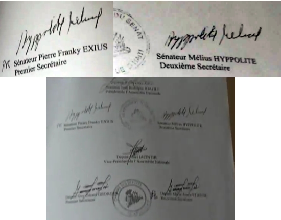 The politico-juridical imbroglio concerning the promulgation of an altered version, in part, of the Constitution, continues to make waves to the Parliament. Earlier this week, some parliamentarians have called for an investigation to explain why the text published in the official newspaper "Le Moniteur" is different from the one sent to the Executive? Indeed, many "errors" appear in the version of the amendments, published May 13, 2011 in the official newspaper "Le Moniteur". For example, several Articles not voted by the Deputies and Senators concerning the duration of the mandate of elected officials were included in this version, while the parliamentarians had chosen at the last minute, to change de return on the vote concerning the extension of mandate for the Deputies of 4 to 5 years and on the two-year extension of the mandate of the senators who must arrive soon to term. Senator Hyppolite Melius (Northwest), Second Secretary of the Senate, said that his signature had "disappeared" mysteriously at the bottom of the amended text "I seek an explanation for this, on the text that I signed who came out of Parliament, there my name as Second Secretary, and because the Senator Pierre Franky Exius, who is First Secretary in the Senate, had an emergency [...] He mandated me so that I sign for him. In the document published in Le Moniteur I was surprised to see that my name was not there, my signature is not there"
