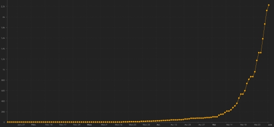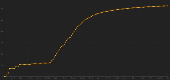 Confirmed cases by department (2,226) : West: 1,809 cases +71 (the day before: +244) Artibonite: 132 cases +13 (the day before: +4) Center: 61 cases unchanged (the day before: +1) North: 58 cases +14 (the day before: +7) South-East: 40 cases unchanged (the day before: +3) North East: 32 cases +4 (the day before: +2) North West: 29 cases (unchanged) South: 27 cases (unchanged) Grand’Anse: 20 cases unchanged Nippes: 18 cases (unchanged) Location of cases (2,226) : Artibonite : (132 cases) +13 Saint Marc : 62 cases +6 (the day before : +1) Gonaïves : 33 cases +4 Verettes : 13 cases +1 Saint Michel : 4 cases (unchanged) Estère : 7 cases unchanged Marchand Dessalines : 7 cases +2 Petite Rivière de l’Artibonite : 2 cases (unchanged) Desdunes : 1 case (unchanged) Ennery : 1 case (unchanged) Grande Saline : 1 case (unchanged) Marmelade : 1 case (unchanged) Center : (61 case) unchanged Mirebalais : 34 cases Hinche : 21 case Belladère : 2 cases Boucain Carré : 1 case Lascaobas : 1 case Saut-d’Eau 1 case Savanette : 1 case Grand'Anse : (20 cases) unchanged Jérémie : 15 cases Chambellan : 4 cases Pestel : 1 case Nippes : (18 cases) unchanged Miragoâne : 4 cases L’Asile : 4 cases Anse à Veau 4 cases Fond des Nègres : 3 cases Paillant : 1 case Petit Trou de Nippes 1 case Plaisance du Sud : 1 case North : (58 cases) +14 Cap Haïtien : 40 cases +13 Limbé : 7 cases +3 Acul du Nord : 2 cases (unchanged) Limonade : 2 cases (unchanged) Milot : 2 cases (unchanged) Plaine du Nord : 2 cases (unchanged) Plaisance du Nord : 2 cases (unchanged) Port Margot : 1 case (unchanged) Nord-Est : (32 cases) +4 Fort Liberté : 14 cases +2 Ouanaminthe : 9 cases+1 Trou du Nord : 7 cases unchanged (the day before : +1) Carice 1 case unchanged Caracol 1 (+1) North-West : (29 cases) unchanged Port-de-Paix : 25 cases Jean Rabel : 2 cases Môle Saint-Nicolas : 1 case Saint-louis du Nord : 1 case West : (1,809 cases) Delmas : 464 cases +18 (the day before : +56) Port-au-Prince : 410 cases +14 (the day before : +43) Pétion-ville : 362* cases -34 (the day before : +90) *Correction of the Ministry Tabarre : 186 cases +17 (the day before : +30) Carrefour : 150 cases +2 (the day before : +29) Croix-des-Bouquets : 114 cases +3 (the day before : +15) Cité Soleil : 38 cases unchanged (the day before : +5) Kenskoff : 28 cases +1 (the day before : +3) Gressier 19 cases unchanged (the day before : +1) Léogâne : 17 cases unchanged Petit-Goâve : 6 cases +1 Cabaret : 5 cases unchanged (the day before : +1) Archaie : 3 cases (unchanged) Ganthier : 3 cases (unchanged) Grand Goâve : 3 cases Thomazeau 1 (+1) South : (27 cases) unchanged Cayes : 20 cases Aquin : 2 cases Camp-Perrin : 1 case Chantal : 1 case Cavaillon 1 case Île-à Vache : 1 case Port-Salut : 1 case South-East : (40 cases) Jacmel : 26 cases unchanged Côte-de-Fer : 4 cases (unchanged) Thiotte : 3 cases (unchanged) Vallée de Jacmel : 3 cases unchanged (the day before : +1) Belle Anse : 2 cases (unchanged) Marigot : 2 cases (unchanged) Distribution of cases by age group (2,124) : 0-19 years: 136 cases (+9), 20-44 years: 1.340 cases (+48), 45-64 years: 591 cases (+37) and 65 years and over: 159 cases (+8). Distribution of deaths by age group (44) : 0-19 years: 2 cases (unchanged), 20-44 years: 12 cases (unchanged), 45-64 years: 16 cases (unchanged) and 65 years and over: 15 cases +1. Healings :: 24 (unchanged) Death : 45 +1 Mortality rate : 2.02% (-) UNITED STATES : Epidemiological situation : United States : Cases since the start of the epidemic : 1,811,277 cases +21,086 in 24 hours (the day before: +19,807) Healings : 458,231 people +13,473 (the day before +28,297) Death : 105,147 deaths +764 in 24h (the day before: +602) Active case (minus deaths and recoveries) : 1,247,899 cases +6,849 in 24 hours (the day before: -9,092) Tests : 17,340,682 people were tested, i.e. +403,791 tests in 24 hours (the day before: +441,448). Graph: Trend of propagation