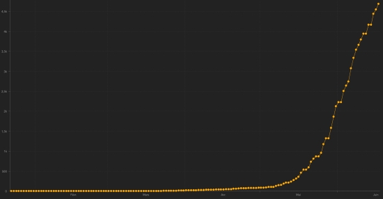 GLOBAL SITUATION : Thursday, June 18, 2020, the number of people infected worldwide by the Covid-19 coronavirus since the start of the pandemic (Official source), amounted to 8,383,277 confirmed cases + 172,635 cases in 24 hours ( the day before: +145,676). Number of contaminated countries 188 (unchanged). Bulletin from the day before : https://www.haitilibre.com/en/news-31051-haiti-covid-19-daily-report-june-17-2020.html Since the start of the pandemic 4,101,877 people have been cured of Covid-19 worldwide +119,003 in 24 hours (the day before: +86,628) Since the start of the pandemic 449,628 people have died from Covid-19 worldwide +5,065 in 24 hours (the day before: +6,959). The number of active cases worldwide (excluding death and recovery) is currently 3,831,772 cases +48,567 in 24 hours (the day before: -55,153). Average mortality rate in the world : 5.36% (-) Average cure rate in the world : 48.93% (+) TOP 5 of the countries with the most active cases : 1st - USA: 1,453,382 cases (+16,117 in 24h), the day before (+15,700) 2nd - Brazil: 387,821 cases (-122 in 24h), the day before (+21,340) 3rd - United Kingdom: 257,175 cases (+924 in 24h), the day before (+1,041) 4th - Russia: 239,254 cases (-2,027 in 24h), the day before (-2,390) 5th - India: 160,384 cases (+5,157 in 24h), the day before (+2,049) TOP 5 of the countries with the most deaths : 1st - USA: 117,717 deaths (+754 in 24 hours), the day before (+836) 2nd - Brazil: 46,510 deaths (+1,269 in 24 hours), the day before (+1,282) 3rd - United Kingdom 42,238 deaths (+184 in 24 hours), the day before (+233) 4th - Italy: 34,448 deaths (+43 in 24 hours), the day before (+34) 5th - France: 29,578 deaths (+51 in 24 hours), the day before (+111) DIASPORA : United States : Cases since the beginning of the epidemic : 2,163,290 cases (+25,559 in 24h), the day before (+23,705) Healings : 592,191 people (+8,688 in 24h), the day before (+7,169) National Healing Rate : 27.37% (+) Death : 117,717 deaths (+754 in 24 hours), the day before (+836) Active cases (less death and recovery): 1,453,382 cases (+16,117 in 24 hours), the day before (+15,700) Canada : Cases since the beginning of the epidemic : 101,491 cases (+404 in 24h), the day before (-324) Healings : 63,280 people (+1,381 in 24h), the day before (+433) National Healing Rate : 62.35% (+) Death : 8,312 deaths (+41 in 24 hours), the day before (+43) Active cases : (excluding death and recovery) 29,899 active cases (-1,018 in 24 hours), the day before (-152) France : Cases confirmed since the first case : 194,805 cases (+458 in 24h), the day before (+42) Healings : 73,791 people (+466 in 24h), the day before (+291) National Healing Rate : 37.88% (+) Death : 29,578 deaths (+51 in 24 hours), the day before (+111) Active cases : (excluding death and recovery) 91,495 cases (-59 in 24h), the day before (-208) Latin America and the Caribbean active cases : Brazil : Brazil: 387,821 cases (-122 in 24h), the day before (+21,340) Peru : 105,029 cases (+134 in 24h), the day before (-1,828) Colombia : 32,796 cases (+1,379 in 24h), the day before (+42) Chile : 35,082 cases (+10,248 in 24h), the day before (-2,448) Mexico : 22.209 (+1.050 in 24h), the day before (+767) Argentina : 24,127 cases (+1,366 in 24h), the day before (+1,012) Ecuador : 20,602 cases (+313 in 24h), the day before (+285) Dominican Republic : 9,256 cases (+318 in 24h), the day before (+297) Panama : 8,353 cases (+622 in 24h), the day before (+523) Haiti : 4,582 (+ 3.15%) +139 in 24h (the day before: +102) French Guiana : 1,392 cases (unchanged) (not updated) Cuba : 197 cases (unchanged within 24 hours), the day before (+2) Jamaica : 165 cases (+3 in 24h), the day before (-19) Martinique : 99 cases (unchanged) (not updated) Guadeloupe : 68 cases (unchanged) (not updated) Bahamas : 21 cases (unchanged) HAITI : Epidemiological situation : The Ministry of Public Health informs that 141 new cases of Covid-19 were confirmed in Haiti (the day before: +106), for a total of 4,688 cases throughout the national territory (40.0% women and 60.0% d 'men) since the first case (March 19, 2020 https://www.haitilibre.com/article-30319-haiti-sante-origine-des-2-premiers-cas-de-covid-19-en-haiti.html ). Deaths : 2 new deaths have been recorded in the North, bringing the national total to 82 Active cases : (less death and recovery): 4.582 (+ 3.15%) +139 in 24 hours (the day before: +102) Number of suspected cases investigated since March 19 : 9,651 cases (+298) in 24 hours the day before (+306). People hospitalized and quarantine at home : information not available Number of tests : information not available Graph *: daily confirmed cases