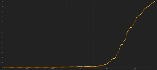 * Note : The Haitian health authorities having "omitted" 10 times to update the number of cases… consequently, this graph is a more positive than reality. Cases confirmed by department : West: 4,882 cases (+51), the day before: (+21) Artibonite: 342 cases (+5), the day before: (+12) Center: 298 cases (+2), the day before: (+9) North: 248 cases (+3), the day before: (+1) South: 173 cases (+9) Southeast: 158 cases (+13) North West: 138 cases (+4), the day before: (+4) Grand’Anse: 133 cases (+1) North-East: 109 cases (+4), the day before: (+5) Nippes: 101 cases (+4), the day before: (+2) Location of cases : West : 4,882 cases (+51) Delmas : 1,210 cases (+11), the day before : (+6) Port-au-Prince : 1,032 cases (+3), the day before : (+4) Pétion-ville : 752 cases (+6), the day before : (+1) Tabarre : 602 cases (+3), the day before : (+4) Croix-des-Bouquets : 455 cases (+6), the day before : (+2) Carrefour : 363 cases (+9), the day before : (+2) Petit-Goâve : 102 cases (+3) Cité Soleil : 84 cases (unchanged) Cabaret : 57 cases (+5) Kenskoff : 54 cases (+1) Léogâne : 51 case (+3) Gressier 31 case (unchanged) Archaie : 30 cases (unchanged), the day before : (+1) Anse à Galet : 27 cases (unchanged) Ganthier : 9 cases (+1), the day before : (+1) Cornillon : 7 cases (unchanged) Grand Goâve : 5 cases (unchanged), the day before : (+1) Fonds-Verettes : 4 (unchanged) Thomazeau : 4 cases (unchanged) Artibonite : 342 cases (+5) Saint Marc : 123 cases (unchanged), the day before : (+2) Gonaïves : 81 case (+2), the day before : (+2) Verettes : 75 cases (+2), the day before : (+5) Petite Rivière de l’Artibonite : 11 case (unchanged) Gros Morne : 13 cases (unchanged), the day before : (+5) L’Estère : 9 cases (unchanged) Marchand Dessalines : 10 cases (+1) Desdunes : 5 cases (unchanged) Saint Michel : 5 cases (unchanged) Ennery : 3 cases (unchanged) La Chappelle : 2 cases (unchanged) Grande Saline : 2 cases (unchanged) Anse Rouge : 2 cases (unchanged) Marmelade : 1 case (unchanged) Center : 298 cases (+2) Mirebalais : 128 cases (+1), the day before : (+6) Hinche : 94 cases (unchanged), the day before : (+1) Boucan Carré : 27 cases (unchanged), the day before : (+1) Lascaobas : 19 cases (+1), the day before : (+1) Belladère : 12 cases (unchanged) Thomonde : 4 cases (unchanged) Savanette : 4 cases (unchanged) Saut-d’Eau 4 cases (unchanged) Cerca la Source : 3 cases (unchanged) Maissade : 2 cases (unchanged) Cerca Cavajal : 1 case (unchanged), the day before : (+1) North : 248 cases (+3) Cap Haïtien : 155 cases (unchanged) Limbé : 18 cases (+1), the day before : (+1) Milot : 12 cases (unchanged) Pignon : 11 case (unchanged) Grande Rivière du Nord : 10 cases (unchanged) Plaine du Nord : 10 cases (unchanged) Plaisance du Nord : 6 cases (+1) Borgne : 6 cases (unchanged) Limonade : 6 cases (unchanged) Quartier Morin : 5 cases (unchanged) Acul du Nord : 4 cases (unchanged) Dondon : 2 cases (+1) Pilate : 1 case (unchanged) Port Margot : 1 case (unchanged) Bahon : 1 case (unchanged) South : 173 cases (+9) Cayes : 104 cases (+2) Aquin : 19 cases (+3) Saint-Louis du Sud : 7 cases (+1) Port-Salut : 7 cases (unchanged) Camp-Perrin : 5 cases (+3) Torbeck : 5 cases (unchanged) Les Anglais : 5 cases (unchanged) Chardonnières : 5 cases (unchanged) Tiburon : 4 cases (unchanged) Port à Piment : 4 cases (unchanged) Coteaux : 2 cases (unchanged) Chantal : 2 cases (unchanged) St Jean du Sud : 2 cases (unchanged) Cavaillon 1 case (unchanged) Île-à Vache : 1 case (unchanged) South-East : 158 cases (+13) Jacmel : 123 cases (+6) Bainet : 9 cases (+6) Vallée de Jacmel : 7 cases (unchanged), Côte-de-Fer : 7 cases (unchanged) Thiotte : 4 cases (unchanged) Marigot : 3 cases (+1) Belle Anse : 2 cases (unchanged) Anse-à-Pitre : 2 cases (unchanged) Cayes Jacmel : 1 case (unchanged) North-West : 138 cases (+4) Port de Paix : 91 case (unchanged), the day before : (+2) Bombardopolis : 12 cases (unchanged) Saint-louis du Nord : 12 cases (+2), the day before : (+2) Jean Rabel : 9 cases (+1) Môle Saint-Nicolas : 8 cases (+1) Chansolme : 3 cases (unchanged) La Tortue : 2 cases (unchanged) Anse-à-Foleur : 1 case (unchanged) Grand'Anse : 133 cases (+1) Jérémie : 104 cases (+1) Anse d’Hainault : 14 (unchanged) Chambellan : 7 cases (unchanged) Pestel : 2 cases (unchanged) Irois : 2 cases (unchanged) Bonbon : 1 case (unchanged) Dame Marie : 1 case (unchanged) Moron : 1 case (unchanged) Roseaux : 1 case (unchanged) North-East : 109 cases (+4) Ouanaminthe : 32 cases (+1) Caracol 27 cases (unchanged), the day before : (+4) Fort Liberté : 20 cases (+1) Trou du Nord : 18 cases (unchanged) Terrier Rouge : 7 cases (+1), the day before : (+1) Mont Organisé : 2 cases (unchanged) Mombon Crochu 1 case (+1) Ferrier : 1 case (unchanged) Carice 1 case (unchanged) Nippes : 101 case (+4) Miragoâne : 46 cases (+1), the day before : (+2) Fond des Nègres : 17 cases (unchanged) Baradères : 8 cases (unchanged) Petite Riviere de Nippes : 6 cases (unchanged) Petit Trou de Nippes : 5 cases (+3) Plaisance du Sud : 5 cases (unchanged) Anse à Veau 5 cases (unchanged) L’Asile : 5 cases (unchanged) Paillant : 2 cases (unchanged) Arnaud : 1 case (unchanged) Grand Boucan : 1 case (unchanged) NOTE : "unchanged" means that there is no new data available: it may be the absence of new cases, unreported or incomplete cases or delay in transmission data to the Ministry which is the most common cause. Distribution of cases by age group : 0-9 years: 176 (unchanged) 10-19 years: 200 (+3) 20-29 years: 1.204 (+24) 30-39 years: 1,985 (+25) 40-49 years: 1,236 (+13) 50-59 years: 812 (+15) 60-69 years: 598 (+10) 70 and over: 371 (+6) Distribution of deaths by age group : 0-9 years: 5 deaths (unchanged) 10-19 years: 2 deaths (unchanged) 20-29 years: 7 deaths (unchanged) 30-39 years: 10 deaths (unchanged), the day before (+1) 40-49 years: 18 deaths (unchanged), the day before (+1) 50-59 years: 28 deaths (+4), the day before (+1) 60-69 years: 21 deaths (+3