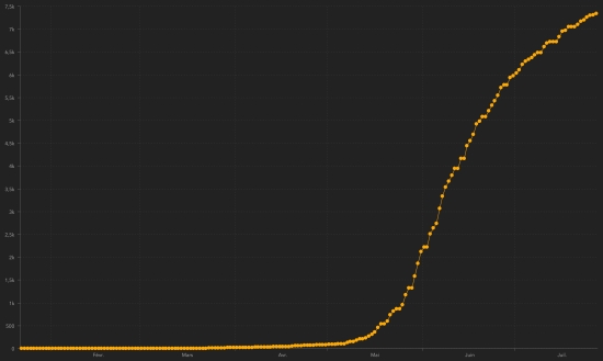 * Note: The Haitian health authorities having "omitted" 14 times to update the number of cases ... this graph represents overall a more positive situation than reality. Cases confirmed by department: West: 5,235 cases (+16), the day before: (+3) Artibonite: 410 cases (unchanged), the day before: (+5) Center: 354 cases (unchanged) North: 337 cases (+5), the day before: (+3) Southeast: 208 cases (unchanged) South: 203 cases (unchanged), the day before: (+1) North-West: 163 cases (+1), the day before: (+1) Northeast: 162 cases (+3), the day before: (+5) Grand'Anse: 149 cases (unchanged) Nippes: 119 cases (unchanged) Location of cases: West : 5,235 cases (+16) Delmas : 1,278 cases (+5), the day before : (+1) Port-au-Prince : 1,078 cases (unchanged) Pétion-ville : 778 cases (+3) Tabarre : 641 case (+2) Croix-des-Bouquets : 495 cases (+2) Carrefour : 399 cases (+3), the day before : (+2) Petit-Goâve : 136 cases (unchanged) Cité Soleil : 89 cases (unchanged) Cabaret : 69 cases (unchanged) Léogâne : 63 cases (unchanged) Kenskoff : 57 cases (unchanged) Gressier 37 cases (unchanged) Archaie : 36 cases (unchanged) Anse à Galet : 31 case (unchanged) Grand Goâve : 12 cases (unchanged) Ganthier : 11 case (unchanged) Cornillon : 8 cases (unchanged) Thomazeau : 8 cases (unchanged) Fonds-Verettes : 6 (unchanged) Pointe à Raquette : 3 cases (+1) Artibonite : 410 cases (unchanged) Saint Marc : 141 case (unchanged), the day before : (+1) Verettes : 95 cases (unchanged) Gonaïves : 91 case (unchanged), the day before : (+1) Gros Morne : 18 cases (unchanged) Petite Rivière de l’Artibonite : 14 cases (unchanged) Marchand Dessalines : 14 cases (unchanged) L’Estère : 9 cases (unchanged) Saint Michel : 7 cases (unchanged) Desdunes : 6 cases (unchanged) Marmelade : 5 cases (unchanged), the day before : (+2) Ennery : 3 cases (unchanged) Grande Saline : 3 cases (unchanged) La Chappelle : 2 cases (unchanged) Anse Rouge : 2 cases (unchanged) Center : 354 cases (unchanged) Mirebalais : 138 cases (unchanged) Hinche : 117 cases (unchanged) Boucan Carré : 29 cases (unchanged) Lascaobas : 24 cases (unchanged) Belladère : 14 cases (unchanged) Thomonde : 11 case (unchanged) Savanette : 6 cases (unchanged) Saut-d’Eau 5 cases (unchanged) Cerca la Source : 4 cases (unchanged) Maissade : 3 cases (unchanged) Cerca Cavajal : 2 cases (unchanged) Thomassique : 1 case (unchanged) North : 337 cases (+5) Cap Haïtien : 204 cases (+4) Limbé : 24 cases (+1), the day before : (+2) Pignon : 14 cases (unchanged), the day before : (+1) Grande Rivière du Nord : 13 cases (unchanged) Milot : 13 cases (unchanged) Plaine du Nord : 11 case (unchanged) Borgne : 11 case (unchanged) Limonade : 10 cases (unchanged) Plaisance du Nord : 9 cases (unchanged) Quartier Morin : 8 cases (unchanged) Pilate : 7 cases (unchanged), the day before : (+1) Acul du Nord : 5 cases (unchanged) Dondon : 3 cases (unchanged) Port Margot : 2 cases (unchanged) Bahon : 1 case (unchanged) Saint Raphaël : 1 case (unchanged) South-Eqst : 208 cases (unchanged) Jacmel : 158 cases (unchanged) Côte-de-Fer : 13 cases (unchanged) Bainet : 13 cases (unchanged) Vallée de Jacmel : 7 cases (unchanged) Thiotte : 6 cases (unchanged) Marigot : 4 cases (unchanged) Belle Anse : 3 cases (unchanged), Anse-à-Pitre : 2 cases (unchanged) Cayes Jacmel : 2 cases (unchanged) South : 203 cases (unchanged) Cayes : 116 cases (unchanged), the day before : (+2) Aquin : 20 cases (unchanged) Saint-Louis du Sud : 11 case (unchanged) Les Anglais : 9 cases (unchanged) Port-Salut : 8 cases (unchanged) Torbeck : 7 cases (unchanged) Chardonnières : 6 cases (unchanged) Camp-Perrin : 6 cases (unchanged) Port à Piment : 5 cases (unchanged) Tiburon : 4 cases (unchanged) Coteaux : 3 cases (unchanged) Chantal : 2 cases (unchanged) Île-à Vache : 2 cases (unchanged) St Jean du Sud : 2 cases (unchanged) Cavaillon 1 case (unchanged) Roche à Bateau : 1 case (unchanged) North-West : 163 cases (+1) Port de Paix : 102 cases (+1), the day before : (+1) Saint-louis du Nord : 16 cases (unchanged) Bombardopolis : 13 cases (unchanged) Môle Saint-Nicolas : 12 cases (unchanged) Jean Rabel : 10 cases (unchanged) Chansolme : 4 cases (unchanged) La Tortue : 3 cases (unchanged) Anse-à-Foleur : 1 case (unchanged) Baie de Henne 1 case (unchanged) Bassin Bleu : 1 case (unchanged) North-East : 162 cases (+3) Ouanaminthe : 54 cases (unchanged), the day before : (+3) Caracol 35 cases (unchanged) Trou du Nord : 27 cases (+1), the day before : (+1) Fort Liberté : 21 case (+1) Terrier Rouge : 7 cases (unchanged) Mombin Crochu 6 cases (unchanged) Perches : 4 cases (unchanged), the day before : (+1) Mont Organisé : 2 cases (unchanged) Carice : 2 cases (unchanged) Capotille : 2 cases (unchanged) Ferrier : 1 case (unchanged) Ste-Suzanne : 1 case (unchanged) Grand'Anse : 149 cases (unchanged) Jérémie : 117 cases (unchanged) Anse d’Hainault : 15 (unchanged) Chambellan : 7 cases (unchanged) Dame Marie : 3 cases (unchanged) Pestel : 2 cases (unchanged) Irois : 2 cases (unchanged) Bonbon : 1 case (unchanged) Moron : 1 case (unchanged) Roseaux : 1 case (unchanged) Nippes : 119 cases (unchanged) Miragoâne : 55 cases (unchanged) Fond des Nègres : 18 cases (unchanged) Baradères : 12 cases (unchanged) Anse à Veau 6 cases (unchanged) Petite Riviere de Nippes : 6 cases (unchanged) Petit Trou de Nippes : 5 cases (unchanged) Plaisance du Sud : 6 cases (unchanged)) L’Asile : 5 cases (unchanged) Paillant : 4 cases (unchanged) Arnaud : 1 case (unchanged) Grand Boucan : 1 case (unchanged) NOTE: “unchanged” means that there are no new data available: it may be no new cases, unreported or incomplete cases or delay in transmission data at the Ministry ... Distribution of confirmed cases: 0-9 years: 207 (+1) 10-19 years: 241 (+1) 20-29 years: 1,394 (+5) 30-39 years: 2,185 (+7) 40-49 years: 1,351 (+2) 50-59 years: 886 (+6) 60-69 years: 652 (unchanged) 70 years and over: 424 (+3) Distribution of deaths by age group: 0-9 years: 