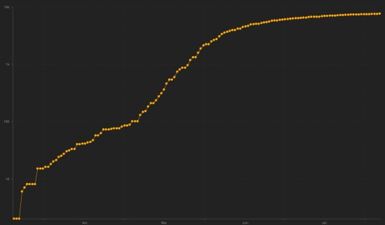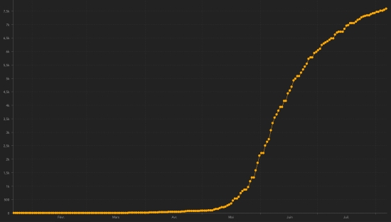 * Warning : The Haitian health authorities having "failed" 17 times to update the number of cases ... these graphs represent overall a more positive situation than reality .. Cases confirmed by department : West: 5.356 cases (+17), the day before: (+7) Artibonitis: 442 cases (+1), the day before: (+4) Center: 378 cases (+7) North: 355 cases (+4), the day before: (+1) Southeast: 214 cases (unchanged) South: 210 cases (+2) Northeast: 180 cases (+2) Northwest: 169 cases (unchanged) Grand'Anse: 154 cases (+4) Nippes: 124 cases (+1) Location of cases : West : 5,356 cases (+17) Delmas : 1,310 cases (+5), the day before : (+2) Port-au-Prince : 1,097 cases (+1) Pétion-ville : 795 cases (+4), the day before : (+3) Tabarre : 655 cases (+1), the day before : (+1) Croix-des-Bouquets : 509 cases (+1), the day before : (+1) Carrefour : 406 cases (+2) Petit-Goâve : 140 cases (unchanged) Cité Soleil : 91 case (+1) Cabaret : 72 cases (unchanged) Léogâne : 65 cases (unchanged) Kenskoff : 57 cases (unchanged) Gressier 39 cases (+1) Archaie : 37 cases (unchanged)) Anse à Galet : 34 cases (unchanged) Grand Goâve : 12 cases (unchanged) Ganthier : 11 case (unchanged) Thomazeau : 9 cases (+1) Cornillon : 8 cases (unchanged) Fonds-Verettes : 6 (unchanged) Pointe à Raquette : 3 cases (unchanged) Artibonite : 442 cases (+1) Saint Marc : 151 case (unchanged), the day before : (+1) Verettes : 104 cases (unchanged), the day before : (+1) Gonaïves : 102 cases (unchanged), the day before : (+1) Gros Morne : 18 cases (unchanged) Marchand Dessalines : 15 cases (unchanged), the day before : (+1) Petite Rivière de l’Artibonite : 14 cases (unchanged) L’Estère : 9 cases (unchanged) Saint Michel : 7 cases (unchanged) Desdunes : 6 cases (unchanged) Marmelade : 6 cases (+1) Ennery : 3 cases (unchanged) Grande Saline : 3 cases (unchanged) La Chappelle : 2 cases (unchanged) Anse Rouge : 2 cases (unchanged) Center : 378 cases (+7) Mirebalais : 142 cases (+2) Hinche : 131 case (+5) Boucan Carré : 30 cases (unchanged) Lascaobas : 25 cases (unchanged) Belladère : 17 cases (unchanged) Thomonde : 12 cases (unchanged) Savanette : 6 cases (unchanged) Saut-d’Eau 5 cases (unchanged) Cerca la Source : 4 cases (unchanged) Maissade : 3 cases (unchanged) Cerca Cavajal : 2 cases (unchanged) Thomassique : 1 case (unchanged) North : 355 cases (+4) Cap Haïtien : 214 cases (+1), the day before : (+1) Limbé : 27 cases (unchanged) Pignon : 17 cases (+1) Grande Rivière du Nord : 14 cases (unchanged) Milot : 13 cases (unchanged) Plaine du Nord : 11 case (unchanged) Borgne : 11 case (unchanged) Limonade : 10 cases (unchanged) Plaisance du Nord : 9 cases (unchanged) Quartier Morin : 8 cases (unchanged) Pilate : 7 cases (unchanged) Acul du Nord : 5 cases (unchanged) Port Margot : 4 cases (+2) Dondon : 3 cases (unchanged) Bahon : 1 case (unchanged) Saint Raphaël : 1 case (unchanged) South-East : 214 cases (unchanged) Jacmel : 162 cases (unchanged) Côte-de-Fer : 14 cases (unchanged) Bainet : 13 cases (unchanged) Vallée de Jacmel : 7 cases (unchanged) Thiotte : 7 cases (unchanged) Marigot : 4 cases (unchanged) Belle Anse : 3 cases (unchanged), Anse-à-Pitre : 2 cases (unchanged) Cayes Jacmel : 2 cases (unchanged) South : 210 cases (+2) Cayes : 119 cases (+2) Aquin : 21 case (unchanged) Saint-Louis du Sud : 11 case (unchanged) Les Anglais : 10 cases (unchanged) Port-Salut : 8 cases (unchanged) Torbeck : 7 cases (unchanged) Chardonnières : 6 cases (unchanged) Camp-Perrin : 6 cases (unchanged) Port à Piment : 5 cases (unchanged) Tiburon : 4 cases (unchanged) Coteaux : 3 cases (unchanged) Chantal : 2 cases (unchanged) Île-à Vache : 2 cases (unchanged) St Jean du Sud : 2 cases (unchanged) Cavaillon 2 cases (unchanged) Roche à Bateau : 1 case (unchanged) Maniche : 1 case (unchanged) North-East : 180 cases (+2) Ouanaminthe : 57 cases (+1) Caracol 36 cases (+1) Trou du Nord : 28 cases (unchanged) Fort Liberté : 24 cases (unchanged) Mombin Crochu 13 cases (unchanged) Terrier Rouge : 7 cases (unchanged) Mont Organisé : 5 cases (unchanged) Perches : 4 cases (unchanged) Carice : 2 cases (unchanged) Capotille : 2 cases (unchanged) Ferrier : 1 case (unchanged) Ste-Suzanne : 1 case (unchanged) North-West : 169 cases (unchanged) Port de Paix : 105 cases (unchanged) Saint-louis du Nord : 17 cases (unchanged) Bombardopolis : 13 cases (unchanged) Môle Saint-Nicolas : 12 cases (unchanged) Jean Rabel : 10 cases (unchanged) Chansolme : 4 cases (unchanged) La Tortue : 4 cases (unchanged) Baie de Henne 2 cases (unchanged) Anse-à-Foleur : 1 case (unchanged) Bassin Bleu : 1 case (unchanged) Grand'Anse : 154 cases (+4) Jérémie : 121 case (+3) Anse d’Hainault : 16 (+1) Chambellan : 7 cases (unchanged) Dame Marie : 3 cases (unchanged) Pestel : 2 cases (unchanged) Irois : 2 cases (unchanged) Bonbon : 1 case (unchanged) Moron : 1 case (unchanged) Roseaux : 1 case (unchanged) Nippes : 124 cases (+1) Miragoâne : 59 cases (+1) Fond des Nègres : 18 cases (unchanged) Baradères : 12 cases (unchanged) Anse à Veau 7 cases (unchanged) Petite Riviere de Nippes : 6 cases (unchanged) Plaisance du Sud : 6 cases (unchanged) Petit Trou de Nippes : 5 cases (unchanged) L’Asile : 5 cases (unchanged) Paillant : 4 cases (unchanged) Arnaud : 1 case (unchanged) Grand Boucan : 1 case (unchanged) Breakdown of confirmed cases : 0-9 years: 215 (+1) 10-19 years: 250 (unchanged) 20-29 years: 1,454 (+10) 30-39 years: 2,245 (+7) 40-49 years: 1,391 (+8) 50-59 years: 911 (+2) 60-69 years: 674 (+3) 70 years and over: 442 (+7) Distribution of deaths by age group : 0-9 years: 8 deaths (unchanged) 10-19 years: 3 deaths (unchanged) 20-29 years: 9 deaths (unchanged) 30-39 years: 13 deaths (unchanged) 40-49 years: 21 deaths (unchanged) 50-59 years: 33 deaths (unchanged) 60-69 years: 29 deaths (unchanged) 70 years and over: 55 deaths (unchanged) Deaths : 171 deaths (unchanged) Death rate : 2.26% (-) UNITED STATES : Epidemiological situation : United States : Cases since the start of t