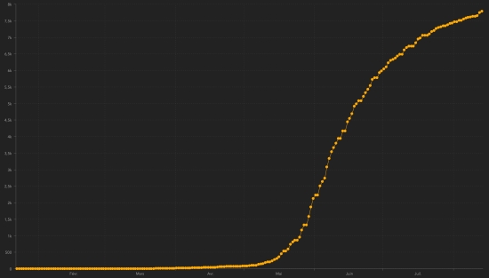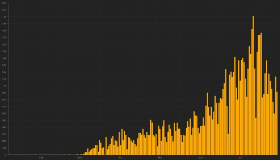 Warning : The Haitian health authorities having "omitted" 18 times to update the number of cases ... Consequently this graph represents a situation overall more positive than reality . Suspected cases investigated since March 19 : 20,733 cases (+166 in 24 hours), previous (+67) Cases tested since the start of the pandemic : 20,119 (+231 tests in 24 hours as of August 11) People currently hospitalized : (information not available) People in intensive care currently : (information not available) People in home quarantine currently : (information not available) Cases confirmed by department : West: 5,483 cases (+16), the day before: (+27) Artibonitis: 459 cases (+5) Center: 387 cases (+1), the day before: (+2) North: 379 cases (unchanged), the day before: (+2) Southeast: 224 cases (+1), the day before: (+3) South: 212 cases (unchanged) Northeast: 192 cases (+1) North-West: 184 cases (unchanged), the day before: (+2) Grand'Anse: 158 cases (+1), the day before: (+1) Nippes: 132 cases (+4), the day before: (+1) Location of cases : West : 5,483 cases (+16) Delmas : 1,336 cases Port-au-Prince : 1,114 Pétion-ville : 817 cases Tabarre : 666 cases Croix-des-Bouquets : 527 Carrefour : 415 cases Petit-Goâve : 144 cases Cité Soleil : 92 cases Cabaret : 72 cases (unchanged) Léogâne : 69 cases Kenskoff : 57 cases (unchanged) Gressier 43 cases (unchanged) Archaie : 39 cases Anse à Galet : 35 cases (unchanged) Grand Goâve : 14 cases (unchanged) Cornillon : 13 cases (unchanged) Ganthier : 12 cases (unchanged) Thomazeau : 9 cases (unchanged) Fonds-Verettes : 6 (unchanged) Pointe à Raquette : 3 cases (unchanged) Artibonite : 459 cases (+5) Saint Marc : 157 cases (+4) Verettes : 111 case (unchanged) Gonaïves : 102 cases (unchanged) Gros Morne : 18 cases (unchanged) Marchand Dessalines : 16 cases (unchanged) Petite Rivière de l’Artibonite : 14 cases (unchanged) L’Estère : 9 cases (unchanged) Saint Michel : 9 cases (+1) Desdunes : 6 cases (unchanged) Marmelade : 6 cases (unchanged) Ennery : 4 cases (unchanged) Grande Saline : 3 cases (unchanged) La Chappelle : 2 cases (unchanged) Anse Rouge : 2 cases (unchanged) Center : 387 cases (+1) Mirebalais : 148 cases (+2), the day before : (+2) Hinche : 133 cases (+1) Boucan Carré : 30 cases (unchanged) Lascaobas : 25 cases (unchanged) Belladère : 18 cases (unchanged) Thomonde : 12 cases (unchanged) Savanette : 6 cases (unchanged) Saut-d’Eau 5 cases (unchanged) Cerca la Source : 4 cases (unchanged) Maissade : 3 cases (unchanged) Cerca Cavajal : 2 cases (unchanged) Thomassique : 1 case (unchanged) North : 379 cases (unchanged) Cap Haïtien : 233 cases (unchanged), the day before : (+1) Limbé : 29 cases (unchanged) Pignon : 18 cases (unchanged), the day before : (+1) Grande Rivière du Nord : 14 cases (unchanged) Milot : 13 cases (unchanged) Plaine du Nord : 11 case (unchanged) Borgne : 11 case (unchanged) Limonade : 10 cases (unchanged) Plaisance du Nord : 9 cases (unchanged) Quartier Morin : 8 cases (unchanged) Pilate : 8 cases (unchanged), the day before : (+1) Acul du Nord : 5 cases (unchanged) Port Margot : 5 cases (unchanged) Dondon : 3 cases (unchanged) Bahon : 1 case (unchanged) Saint Raphaël : 1 case (unchanged) South-East : 224 cases (+1) Jacmel : 169 cases (+1), the day before : (+1) Côte-de-Fer : 14 cases (unchanged) Bainet : 13 cases (unchanged) Vallée de Jacmel : 7 cases (unchanged) Thiotte : 7 cases (unchanged) Marigot : 5 cases (unchanged) Belle Anse : 4 cases ((unchanged), the day before : (+1) Cayes Jacmel : 3 cases ((unchanged), the day before : (+1) Anse-à-Pitre : 2 cases (unchanged) South : 212 cases (unchanged) Cayes : 121 case (unchanged) Aquin : 21 case (unchanged) Saint-Louis du Sud : 11 case (unchanged) Les Anglais : 10 cases (unchanged) Port-Salut : 8 cases (unchanged) Torbeck : 7 cases (unchanged) Chardonnières : 6 cases (unchanged) Camp-Perrin : 6 cases (unchanged) Port à Piment : 5 cases (unchanged) Tiburon : 4 cases (unchanged) Coteaux : 3 cases (unchanged) Chantal : 2 cases (unchanged) Île-à Vache : 2 cases (unchanged) St Jean du Sud : 2 cases (unchanged) Cavaillon 2 cases (unchanged) Roche à Bateau : 1 case (unchanged) Maniche : 1 case (unchanged) Norh-East : 192 cases (+1) Ouanaminthe : 60 cases (+1) Caracol 37 cases (unchanged) Trou du Nord : 28 cases (unchanged) Fort Liberté : 25 cases (unchanged) Mombin Crochu 18 cases (unchanged) Terrier Rouge : 7 cases (unchanged) Perches : 5 cases (unchanged) Mont Organisé : 5 cases (unchanged) Ferrier : 2 cases (unchanged) Carice : 2 cases (unchanged) Capotille : 2 cases (unchanged) Ste-Suzanne : 1 case (unchanged) North-West : 184 cases (unchanged) Port de Paix : 110 cases (unchanged), the day before : (+2) Saint-louis du Nord : 21 case (unchanged) Bombardopolis : 13 cases (unchanged) Môle Saint-Nicolas : 12 cases (unchanged) Jean Rabel : 11 case (unchanged) Bassin Bleu : 5 cases (unchanged) Chansolme : 4 cases (unchanged) La Tortue : 4 cases (unchanged) Baie de Henne 2 cases (unchanged) Anse-à-Foleur : 2 cases (unchanged) Grand'Anse : 158 cases (+1) Jérémie : 125 cases (+1), the day before : (+1) Anse d’Hainault : 16 (unchanged) Chambellan : 7 cases (unchanged) Dame Marie : 3 cases (unchanged) Pestel : 2 cases (unchanged) Irois : 2 cases (unchanged) Bonbon : 1 case (unchanged) Moron : 1 case (unchanged) Roseaux : 1 case (unchanged) Nippes : 132 cases (+4) Miragoâne : 63 cases (+4) Fond des Nègres : 20 cases (unchanged), the day before : (+1) Baradères : 12 cases (unchanged) Anse à Veau 7 cases (unchanged) Petite Riviere de Nippes : 6 cases (unchanged) Plaisance du Sud : 6 cases (unchanged) Petit Trou de Nippes : 6 cases (unchanged), the day before : (+1) L’Asile : 5 cases (unchanged) Paillant : 4 cases (unchanged) Arnaud : 2 cases (unchanged) Grand Boucan : 1 case (unchanged) NOTE : "unchanged" means that there is no new data available: it may be no new cases, unreported or incomplete cases or delay in transmission data at the Ministry ... Distribution o