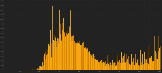 The downtrend has continued since July 16, but more slowly. New York State: Cases since the start of the epidemic: 447,262 cases (+896 in 24 hours), the day before (+652) Healings: 75,962 people (+59 in 24 hours), the day before (+56) Death: 33,070 deaths (+28 in 24 hours) the day before (+4) Death rate: 7.39% (-) Active cases (less deaths and cures): 338,230 cases (+809 in 24 hours), the day before (+592) Tests: 9,621,920 people tested (+91,504 in 24 hours), the day before (+75,087) State of Massachusetts: Cases since the start of the epidemic: 126,128 cases (+429 in 24 hours), the day before (+306) Heals: 109,397 people healed (updated every 5 days) Death: 9,260 deaths (+15 in 24 hours), previous (+20) Death rate: 7.34% (-) Active cases (less deaths and recoveries): 7,471 cases (-486 in 24 hours), the day before (-710) Tests: 3,199,563 people tested (+67,849 in 24h), previous (+55,902) Florida: Cases since the start of the epidemic (March 1, 2020): 674,456 cases (+3,255 cases in 24 hours), the day before (+2,355) Death: 13,086 deaths (+147 in 24 hours), the day before (+152) Death rate: 1.94% (+) Tests: 5,010,973 (+26,950 in 24 hours), the day before (+15,176) Miami Dade (FL): Cases since the start of the epidemic: 165,595 cases (+448 in 24 hours), the day before (+459) Death: 2,977 deaths (+22 in 24 hours), the day before (+32) Death rate: 1.8% (+) QUEBEC: Epidemiological situation: Cases confirmed since the first case (February 27, 2020): 66,356 cases (+499 in 24 hours), the day before (+303) Healing: 58,012 people (+208 in 24 hours), the day before (+176) Death: 5,791 (+3 in 24 hours), the day before (+3) Active cases: (excluding death and recovery) 2,553 cases (+288 in 24 hours), the day before (+124) Hospitals: 136 people hospitalized (+6 in 24 hours) the day before (-3) Intensive care: 29 people (+3 in 24 hours), the day before (+3) In Montreal, epicenter of the pandemic in Quebec where the largest Haitian community is located (nearly 150,000 members): 30,963 cases have been confirmed since the start of the epidemic (+295), previous (+97). TOP 5 of the most contaminated Montreal boroughs: 1 - Montreal North: 2,727 cases (+11 in 24 hours), the day before (+4) 2 - Mercier – Hochelaga-Maisonneuve: 2,564 cases (+18 in 34 hours), the day before (+7) 3 - Ahuntsic-Cartierville: 2,566 (+21 in 24), the day before (+5) 4 - Côte-des-Neiges – Notre-Dame-de-Grâce: 2,455 cases (+27 in 24 hours), the day before (+5) 5 - Rivière-des-Prairies – Pointe-aux-Trembles: 2,318 cases (+15 in 24 hours), the day before (+13) TOP 5 of the most contaminated regions of Quebec: 1 - Montreal: 30,668 cases (+97 in 24 hours), the day before (+39) 2 - Montérégie: 9,799 cases (+35 in 24 hours), the day before: (+15) 3 - Laval: 6,585 (+24 in 24h), the day before: (+18) 4 - Lanaudière: 5,010 (+6 in 24h), the day before: (+6) 5 - Laurentians: 4,420 cases (+18 in 24 hours), the day before: (+13) Province of Quebec Healing Rate: 87.43% (-) Death rate: 8.73% (-) DOMINICAN REPUBLIC: Epidemiological situation: Cases confirmed since March 1: : 106,136 cases (+615 in 24 hours), the day before (+718). First case (March 1, 2020) https://www.haitilibre.com/en/news-30165-haiti-flash-first-case-of-covid-19-in-the-dominican-republic.html Heals: 79,363 healings (+472 in 24h), the day before (+504) Deaths: 2,022 deaths since March 1 (+13 in 24 hours), the day before +11) active cases: (excluding death and recovery) 24,751 cases (+130 in 24 hours), the day before (+203) Hospital occupancy rate: Covid-19 beds: 26% (=) Intensive care beds: 40% (=) Beds with assisted ventilation: 28% (=) Top 5 of the most infected provinces (active case, less healings and deaths): 1 - National district: 5,107 cases (-13 in 24 hours), the day before (-19) 2 - Santiago: 2,733 (+24 in 48 hours), the day before (-43) 3 - Santo Domingo: 2,836 cases (+20 in 24 hours), the day before (+8) 4 - La Vega: 942 (-11 in 24 hours), the day before (unchanged) 5 - La Altagracia: 679 (+20 in 24 hours), the day before (-8) Tests (since the 1st case): 433,848 tests (+4.425 in 24 hours), the day before (+3.921) National Healing Rate: 74.77% (+) Death rate: 1.91% (+) FRANCE: Epidemiological situation: Confirmed cases since the first case: 449,240 (+10,593 in 24h), previous (+9,784) France: Number of daily confirmed cases