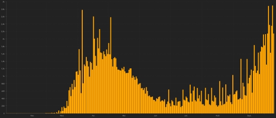 Slight slowdown in the uptrend for 3 days. Average cure rate in the world: 69.57% (+) Average death rate in the world: 2.88% (-) TOP 5 countries with the most active cases: (less deaths and recoveries) 1st - USA: 4,441,586 cases (+29,787 in 24 hours), the day before (+39,118) 2nd - India: 867,496 cases (-15,689 in 24 hours), the day before (-10,407) 3rd - Spain: 677,807 (information not available), the day before (+12,547) 4th - France: 619,009 (+26,359 in 24 hours), the day before (+19,755) 5th - United Kingdom 548,220 (+15,087 in 24 hours), the day before (+13,786) TOP 5 countries with the most deaths: 1st - USA: 214,377 deaths (+590 in 24 hours), the day before (+1,003) 2nd - Brazil: 150,198 deaths (+559 in 48 hours), the day before (+682) 3rd - India: 108,334 deaths (+918 in 24 hours), the day before (+926) 4th - Mexico: 83,642 deaths (+145 in 24 hours), the day before (+401) 5th - United Kingdom 42,850 deaths (+81 in 24 hours), the day before (+87) TOP 5 countries with the highest total number of healings: 1st - India: 6,077,976 healings (+89,154 in 24h), cure rate 86.17% (+) 2nd - Brazil: 4,526,393 cures (+23,539 in 24 hours), cure rate 89.06% (=) 3rd - USA: 3,062,983 people (+23,894 in 24 hours), cure rate 39.68% (+) 4th - Russia: 1,016,120 healings (+4,209 in 24 hours), cure rate 78.67% (-) 5th - Colombia: 783,131 healings (+2,584 in 24h), cure rate 86.75% (-) DIASPORA: USA: Case since the first case (March 9, 2020): 7,718,946 cases (+54,271 in 24 hours), the day before (+57,426) Healings: 3,062,983 people (+23,894 in 24 hours), the day before (+17,837) National Healing Rate: 39.68% (+) Deaths: 214,377 deaths (+590 in 24 hours), the day before (+1,003) Active cases (less deaths and cures): 4,441,586 cases (+29,787 in 24 hours), the day before (+39,118) Canada: Cases since the start of the epidemic: 182,767 cases (+2,142 in 24 hours), the day before (+2,895) Healings: 153,857 people (+1,811 in 24 hours), the day before (+2,354) National Healing Rate: 84.18% (=) Death: 9,661 deaths (+23 in 24 hours), the day before (+29) National death rate: 5.29% (-) Active cases: (excluding death and recovery) 19,249 cases (+308 in 24 hours), the day before (+512) Canada: Number of daily confirmed cases