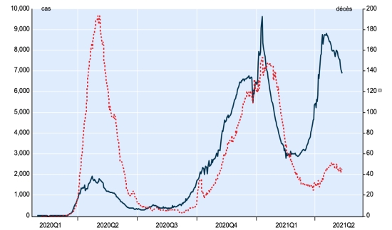 New case in blue numbers on the left - New deaths in red numbers on the right France: * Cases confirmed since the first case (January 24, 2020): 5,863,839 cases (+15,685), the day before (+ 7,025) ** Healings: 5,080,344 people (+37,760 in 24 hours), the day before (+43,374) National Healing Rate: 86.63% (+) Deaths: 107,535 deaths (+112 in 24 hours in hospitals +0 in EMS / EHPAD), the day before in total, (+173) * Active cases: (excluding death and cures) 675,960 (-22,187 in 24 hours), the day before (-36,522) Latin America and the Caribbean active cases (less deaths and recoveries): * Brazil: 1,093,365 cases (+33,192 in 24 hours), the day before (+33,271) * Argentina: 286,736 cases (+267 in 24 hours), the day before (+5,055) * Mexico: 260,568 cases (+319 in 24 hours), the day before (+518) * Colombia: 119,907 cases (+4,687 in 24 hours), the day before (+1,757) * Peru: 98,020 cases (+5,244 in 24 hours), the day before (+5,441) * Ecuador: 46,950 cases (+2,340 in 24 hours), the day before (+1,147) Dominican Republic: 39,272 cases (+384 in 24 hours) the day before (+754) * Chile: 37,701 cases (+228 in 24 hours), the day before (+2,568) * Jamaica: 23,377 cases (-40 in 24 hours), the day before (-8) * Guadeloupe: 13,554 cases (unavailable 2nd day), the day before (unavailable) * Martinique: 11.548 (unavailable 2nd day), the day before (unavailable) * French Guiana: 11,362 cases (unavailable), the day before (+32) * Cuba: 6,920 cases (+411 in 24 hours), the day before (+219) * Panama: 5,299 cases (+218 in 24 hours), the day before (+272) * Bahamas: 841 cases (unavailable 2nd day), the day before (unavailable) Haiti: 668 cases (unavailable), the day before (unavailable HAITI: Epidemiological situation: Warning: The Ministry of Public Health and Population (MSPP) did not make available after May 12, 2021 daily data on the situation of Covid-19 in Haiti As a result , the information below on the situation in Haiti is the latest data available . According to the Ministry of Public Health, 40 new cases of Covid-19 were confirmed in Haiti on May 12, 2021 (latest partial data available) for a total of 13,393 cases confirmed throughout the national territory since the first case (March 19, 2020 https://www.haitilibre.com/en/news-30319-haiti-health-origin-of-the-first-2-cases-of-covid-19-in-haiti.html). Last update (85 new cases on May 10 and 11, 2021) Healings: 12,419 people (+5 in 24 hours) Healing rate: 92.72% (-) Deaths: 271 deaths, (unchanged since May 10) Death rate: 2.02% (=) Active cases: (less deaths and recoveries) 703 cases (+35 in 24 hours), previous (+66 in 48 hours) Imported cases: 152 cases since the reopening of airports and +43 since the last report dated July 9 (109 cases) https://www.haitilibre.com/en/news-31348-haiti-flash-152-cases-imported-since-the-reopening-of-airports.html (Since then, this information is no longer made available) Suspected cases since March 19: 63,715 cases (+529 in 48 hours) update May 11, latest data available. Cases tested since the start of the pandemic: 66,281 cases (+310 in 24 hours) update May 12, latest data available. Note that the very low number of people tested does not statistically make it possible to make a representative estimate of the cases of Covid-19 in Haiti. People hospitalized: 1,938 on May 11. (since the start of the epidemic, latest data available) People in intensive care: (not available) Person in isolation: 668 as of May 10 (latest data available) People currently treated at home: 1,141 as of May 10, latest data available). Cases confirmed by department: West: 9,490 (+27) North: 829 (+1) Artibonite: 698 (+5) Center: 699 (+5) North-East: 382 (+2) South-East: 307 (unchanged) South: 300 (unchanged) Northwest: 288 (unchanged) Grand'Anse: 239 Nippes: 161 (unchanged) UNITED STATES: Epidemiological situation: United States: * Case since the first case (March 9, 2020): 33,695,916 cases (+31,903 in 24 hours), the day before (+37,916) * Healings: 27,098,620 healings (+385,799 in 24 hours), the day before (+45,622) National Healing Rate: 80.42% (+) * Death: 599,863 deaths (+549 in 24 hours), the day before (+774) National death rate: 1.78% (=) * Active cases (less deaths and recoveries): 5,997,433 cases, (-354,445 in 24 hours), the day before (-8,480) * Tests: 465,224,944 people tested since the first case. USA: Number of daily confirmed cases: