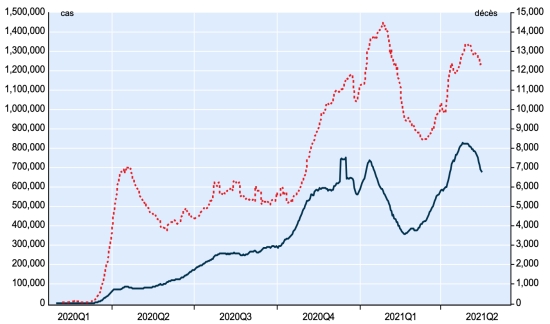 New case in blue numbers on the left - New deaths in red numbers on the right Vaccination: 1.5 billion doses of vaccine injected (+30 million doses injected in 24 hours updated May 17, 2021 latest data available). TOP 5 countries with the most active cases: (less deaths and recoveries) 1st - USA: 5,944,597 cases, (-35,187 in 24 hours), the day before (-17,649) 2nd * - India: 3,353,733 cases (-163,243 in 24 hours), the day before (-101,447) 3rd * - Brazil: 1,071,811 cases (-22,554 in 24 hours), the day before (+1,000) 4th - France: 620.759 (-32.626 in 24 hours), the day before (-22.575) 5th * - Iran: 446,240 cases (-1,868 in 24 hours), the day before (-4,283) TOP 5 countries with the most deaths: 1st - USA: 600,533 deaths (+386 in 24 hours), the day before (+284 2nd * - Brazil: 436,862 deaths (+1,039 in 24 hours), the day before (+971) 3rd * - India: 278,751 deaths (+4,340 in 24 hours), the day before (+4,092) 4th * - Mexico: 220,489 deaths (+56 in 24 hours), the day before (+53) 5th * - United Kingdom: 127,684 deaths (+5 in 24 hours), the day before (+4) TOP 5 countries with the highest number of healings: 1st - USA: 27,202,309 healings (+66,289 in 24 hours), cure rate 80.60% (+) 2nd * - India: 21,596,512 healings (+422,436 in 24 hours), cure rate 85.60% (+) 3rd * - Brazil: 14,152,433 healings (+55,146 in 24h), cure rate 90.36% (+) 4th * - France: 5,152,566 people (+35,780 in 24 hours), cure rate 87.61% (+) 5th * - Turkey: 4,961,120 people (+13,864 in 24 hours), cure rate 96.67% (+) DIASPORA: United States: * Case since the first case (March 9, 2020): 33,747,439 cases (+31,488 in 24 hours), the day before (+20,035) * Healings: 27,202,309 healings (+66,289 in 24 hours), the day before (+37,400) National Healing Rate: 80.60% (+) * Death: 600,533 deaths (+386 in 24 hours), the day before (+284) * Active cases (less deaths and recoveries): 5,944,597 cases, (-35,187 in 24 hours), the day before (-17,649) Canada: * Cases since the start of the epidemic (January 25, 2020): 1,334,108 cases (+5,526 in 24 hours), previous (+4.901) * Healings: 1,241,500 people (+8,213 in 24h), previous (+6,417) National Healing Rate: 93.05% (+) * Death: 24,983 deaths (+35 in 24h), previous (+40) National death rate: 1.87% (=) * Active cases: (excluding death and recovery) 67.625 (-2.722 in 24 hours), previous (-1.556) Vaccination: 18.81 million doses of vaccine injected since December 14, 2020 date of the first injection in Canada (+390,000 doses injected in 24 hours updated May 17, 2021 latest data available). Canada: Number of daily confirmed cases