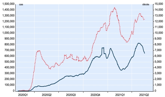 New cases in blue numbers on the left - New deaths in red numbers on the right France: * Cases confirmed since the first case (January 24, 2020): 5,568,551 ** cases (+15,515), the day before (+ 19,050) ** figure corrected by the Public Health France SPF (-348,846 case) * Healings: 5,162,624 people (), the day before (+29,118) National Healing Rate: 92.71% (+) SPF correction Death: 108,314 (+133 in 24 hours in hospitals +0 in EMS / EHPAD), the day before in total, (+141) * Active cases: (excluding death and cures) 297,613 (SPF correction), the day before (-11,811) Latin America and the Caribbean active cases (less deaths and recoveries): * Brazil: 1,068,205 cases (-24,996 in 24 hours), the day before (-5,288) * Argentina: 339,211 cases (+9,466 in 24 hours), the day before (+22,333) * Mexico: 259,873 cases (+749 in 24 hours), the day before (-51) * Peru: 122,442 cases (+6.526 in 24 hours), the day before (+5.451) advance by one place * Colombia: 114,746 cases (-2,324 in 24 hours), the day before (+2,475) Dominican Republic: 42,110 cases (+927 in 24 hours) the day before (+601) * Ecuador: 40,734 cases (+2,305 in 24 hours), the day before (+1,339 ) advance one place * Chile: 38,716 cases (+2,665 in 24 hours), the day before (-799) * Jamaica: 23,127 cases (-23 in 24 hours), the day before (-41) * Guadeloupe: 14,059 cases (unavailable), the day before (+505 in 6 days) * French Guiana: 12,503 cases (+226 in 24 hours), the day before (+267) * Martinique: 11.675 (unavailable 2nd day), the day before (unavailable) * Cuba: 6,912 cases (-66 in 24 hours), the day before (+210) * Panama: 5,821 cases (+159 in 48 hours), the day before (+126) * Bahamas: 953 cases (+7 in 24 hours), the day before (+10) Haiti: 885 cases (unavailable), the day before (+26) HAITI: Epidemiological situation: Warning: The Ministry of Public Health and Population (MSPP) did not make available after May 16, 2019 daily data on the situation of Covid-19 in Haiti As a result , the information below on the situation in Haiti is the latest data available . According to the Ministry of Public Health, 26 new cases of Covid-19 were confirmed in Haiti on May 16, 2021 (latest partial data available) for a total of 13,624 cases confirmed throughout the national territory since the first case (March 19, 2020 https://www.haitilibre.com/en/news-30319-haiti-health-origin-of-the-first-2-cases-of-covid-19-in-haiti.html ). Last update (78 new cases on May 15, 2021) Healings: 12,463 people (unchanged since May 15) Healing rate: 91.47% (-) Deaths: 276 deaths, (unchanged since May 15) Death rate: 2.02% (=) Active cases: (less deaths and cures) 885 cases (+26 in 24 hours), the day before (+50) Imported cases: 152 cases since the reopening of airports and +43 since the last report dated July 9 (109 cases) https://www.haitilibre.com/en/news-31348-haiti-flash-152-cases-imported-since-the-reopening-of-airports.html (Since then, this information is no longer made available) Suspected cases since March 19: 64,303 cases (+69 in 24 hours) update May 16, latest data available. Cases tested since the start of the pandemic: 67,472 cases (+139 in 24 hours) update May 16, latest data available. Note that the very low number of people tested does not statistically make it possible to make a representative estimate of the cases of Covid-19 in Haiti. People hospitalized: 1,966 since the start of the epidemic (updated May 16, 2021, latest data available) People in intensive care: (not available) Person in isolation: 885 as of May 15 (latest data available) People currently treated at home: 1,225 as of May 14, latest data available). Cases confirmed by department: West: 9,715 (+24) North: 842 (unchanged) Artibonite: 703 (+1) Center: 706 (+1) Northeast: 383 (unchanged) South-East: 307 (unchanged) South: 302 (unchanged) Northwest: 288 (unchanged) Grand'Anse: 240 (unchanged) Nippes: 161 (unchanged) UNITED STATES: Epidemiological situation: United States: * Case since the first case (March 9, 2020): 33,833,181 cases (+30,857 in 24 hours), the day before (+27,379) * Healings: 27,358,651 healings (+59,571 in 24h), the day before (+45,853) National Healing Rate: 80.86% (+) * Death: 602,616 deaths (+667 in 24 hours), the day before (+619) National death rate: 1.78% (=) * Active cases (less deaths and recoveries): 5,871,914 cases, (-29,281 in 24 hours), the day before (-19,093) * Tests: 470,118,034 people tested since the first case. USA: Number of daily confirmed cases: