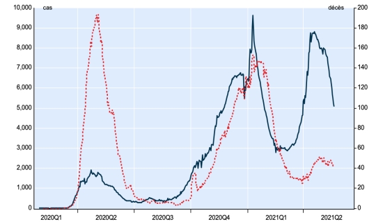 New cases in blue numbers on the left - New deaths in red numbers on the right France: * Cases confirmed since the first case (January 24, 2020): 5,581,351 cases (+12,800), the day before (+ 15,515) * Healings: 5,186,704 people (24,080), the day before () National Healing Rate: 92.92% (+) Death: 108,423 (+109 in 24 hours in hospitals +0 in EMS / EHPAD), the day before in total, (+133) * Active cases: (excluding death and recovery) 286,210 (-11,403), the day before (-11,811) Latin America and the Caribbean active cases (less deaths and recoveries): * Brazil: 1,107,420 cases (+39,215 in 24 hours), the day before (-24,996) * Argentina: 348,976 cases (+9,765 in 24 hours), the day before (+9,466) * Mexico: 262,301 cases (+2,428 in 24 hours), the day before (+749) * Peru: 127,332 cases (+4,890 in 24 hours), the day before (+6,526) * Colombia: 110,208 cases (-4,538 in 24 hours), the day before (-2,324) Dominican Republic: 42,419 cases (+309 in 24 hours) the day before (+601) * Ecuador: 42,015 cases (+1,281 in 24 hours), the day before (+2,305) * Chile: 41,635 cases (+2,919 in 24 hours), the day before (+2,665) * Jamaica: 23,130 cases (+3 in 24 hours), the day before (-23) * Guadeloupe: 14,059 cases (unavailable 2nd day), the day before (unavailable) * French Guiana: 12,673 cases (+170 in 24 hours), the day before (+226) * Martinique: 11.675 (unavailable 3rd day), the day before (unavailable) * Cuba: 6,930 cases (+18 in 24 hours), the day before (-66) * Panama: 5,876 cases (+55 in 48 hours), the day before (+159) Haiti: 976 cases (+91 in 48 hours), previous (+26) advance by one place * Bahamas: 953 cases (unavailable), the day before (+7) HAITI: Epidemiological situation: According to the Ministry of Public Health, 111 new cases of Covid-19 were confirmed in Haiti on May 17 and 18, 2021 (latest partial data available) for a total of 13,735 cases confirmed throughout the national territory since the first case (March 19, 2020 https://www.haitilibre.com/en/news-30319-haiti-health-origin-of-the-first-2-cases-of-covid-19-in-haiti.html). Last update (26 new cases on May 18, 2021) Healings: 12,479 people (+16 in 72h) Healing rate: 90.85% (-) Deaths: 280 deaths, (+4 in 72h) Mortality rate: 2.03% (+) Active cases: (less deaths and cures) 976 cases (+91 in 48 hours), the day before (+26) Imported cases: 152 cases since the reopening of airports and +43 since the last report dated July 9 (109 cases) https://www.haitilibre.com/en/news-31348-haiti-flash-152-cases-imported-since-the-reopening-of-airports.html (Since then, this information is no longer made available) Suspected cases since March 19: 64,789 cases (+555 in 48 hours) update May 16, latest data available. Cases tested since the start of the pandemic: 68,186 67,884 cases (+714 in 48 hours) update 17 May, latest data available. Note that the very low number of people tested does not statistically make it possible to make a representative estimate of the cases of Covid-19 in Haiti. People hospitalized: 2,017 since the start of the epidemic (updated May 18, 2021, latest data available) People in intensive care: (not available) Person in isolation: 976 as of May 17 (latest data available) People currently treated at home: 1,225 as of May 17, latest data available). Cases confirmed by department: West: 9,715 (+79) North: 851 (+11) Artibonite: 707 (+4) +2 (+6) Center: 707 (+8) North-East: 385 (+2) South-East: 307 (unchanged) South: 302 (unchanged) North-West: 292 (+4) Grand'Anse: 241 (+1) Nippes: 161 (unchanged) UNITED STATES: Epidemiological situation: United States: * Case since the first case (March 9, 2020): 33,862,398 cases (+29,217 in 24 hours), the day before (+30,857) * Healings: 27,399,429 healings (+40,778 in 24h), the day before (+59,571) National Healing Rate: 80.91% (+) * Death: 603,408 deaths (+792 in 24 hours), the day before (+667) National death rate: 1.78% (=) * Active cases (less deaths and recoveries): 5,859,561 cases, (-12,353 in 24 hours), the day before (-29,281) * Tests: 471,543,912 people tested since the first case. USA: Number of daily confirmed cases: