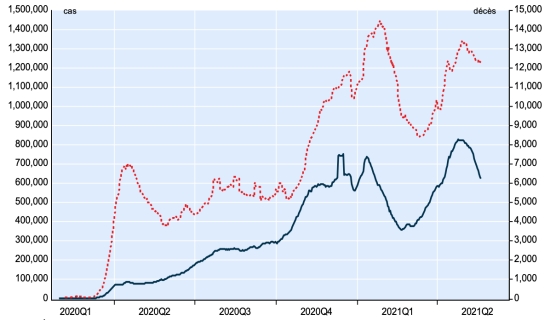 New cases in blue numbers on the left - New deaths in red numbers on the right Vaccination: 1.56 billion doses of vaccine injected (+30 million doses injected in 24 hours updated May 19, 2021 latest data available). TOP 5 countries with the most active cases: (less deaths and recoveries) 1st - USA: 5,859,561 cases, (-12,353 in 24 hours), the day before (-29,281) 2nd * - India: 2,923,400 cases (-104,491 in 24 hours), the day before (-101,953) 3rd * - Brazil: 1,107,420 cases (+39,215 in 24 hours), the day before (-24,996) 4th * - Iran: 432,864 cases (-3,161 in 24 hours), the day before (-5,695) 5th * - Argentina 348,976 cases (+9,765 in 24 hours), the day before (enters the TOP 5) TOP 5 countries with the most deaths: 1st - USA: 603,408 deaths (+792 in 24 hours), the day before (+667) 2nd * - Brazil: 446,527 deaths (+2,136 in 24 hours), the day before (+2,527) 3rd * - India: 295,525 deaths (+4,160 in 24 hours), the day before (+4,209) 4th * - Mexico: 221,256 deaths (+176 in 24 hours), the day before (+230) 5th * - United Kingdom: 127,710 deaths (+9 in 24 hours), the day before (+7) TOP 5 countries with the highest number of healings: 1st - USA: 27,399,429 healings (+40,778 in 24h), cure rate 80.91% (+) 2nd * - India: 23,070,365 healings (+357,630 in 24 hours), cure rate 87.75% (+) 3rd * - Brazil: 14,422,209 healings (+36,247 in 24 hours), cure rate 90.27% (-) 4th * - France: 5,186,704 people (24,080), cure rate 92.92% (+) 5th * - Turkey: 4,998,639 people (+8,852 in 24 hours), cure rate 96.68% (-) DIASPORA: United States: * Case since the first case (March 9, 2020): 33,862,398 cases (+29,217 in 24 hours), the day before (+30,857) * Healings: 27,399,429 healings (+40,778 in 24h), the day before (+59,571) National Healing Rate: 80.91% (+) * Death: 603,408 deaths (+792 in 24 hours), the day before (+667) * Active cases (less deaths and recoveries): 5,859,561 cases, (-12,353 in 24 hours), the day before (-29,281) Canada: * Cases since the start of the epidemic (January 25, 2020): 1,352,121 cases (+4,676 in 24 hours), previous (+5,057) * Healings: 1,268,989 people (+6,623 in 24 hours), previous (+6,652) National Healing Rate: 93.85% (+) * Death: 25,162 deaths (+51 in 24h), previous (+45) National death rate: 1.86% (=) * Active cases: (excluding death and recovery) 57.970 (-1.998 in 24 hours), previous (-1.640) Vaccination: 19.44 million doses of vaccine injected since December 14, 2020 date of the first injection in Canada (+350,000 doses injected in 24 hours updated May 18, 2021 latest data available). Canada: Number of daily confirmed cases