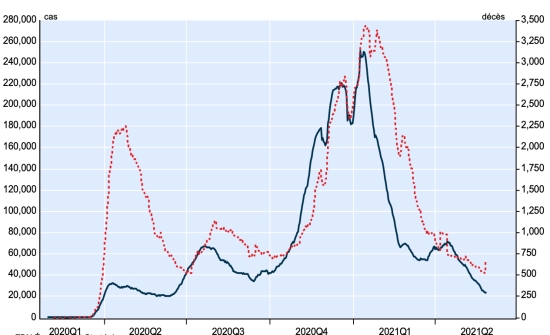 New cases in blue numbers on the left - New deaths in red numbers on the right Vaccination: 1.87 billion doses of vaccine injected (+30 million doses injected in 24 hours updated May 29, 2021 latest data available). TOP 5 countries with the most active cases: (less deaths and recoveries) 1st - USA: 5,606,936 cases, (-39,720 in 24 hours), the day before (-43,419) 2nd * - India: 2,114,482 cases (-114,242 in 24 hours), the day before (-114,428) 3rd * - Brazil: 1,140,762 cases (+18,542 in 24 hours), the day before (+23,103) 4th * - Iran: 388,444 cases (-7,847 in 24 hours), the day before (-3,643) 5th * - Argentina 366,688 cases (-6,198 in 24 hours), the day before (+5,280) TOP 5 countries with the most deaths: 1st - USA: 609,421 deaths (+460 in 24 hours), the day before (+1,235) 2nd * - Brazil: 461,142 deaths (+1,971 in 24 hours), the day before (+2,418) 3rd * - India: 325,998 deaths (+3,486 in 24 hours), the day before (+3,617) 4th * - Mexico: 223,455 deaths (+387 in 24 hours), the day before (+411) 5th * - United Kingdom: 127,775 deaths (+7 in 24 hours), the day before (+10) TOP 5 countries with the highest number of healings: 1st - USA: 27,818,961 healings (+51,921 in 24 hours), cure rate 81.73% (+) 2nd * - India: 25,454,320 healings (+276,309 in 24 hours), cure rate 91.25% (+) 3rd * - Brazil: 14,869,696 healings (+58,430 in 24h), cure rate 90.27% (-) 4th * - France: 5,312,173 people (+8,459 in 24 hours), cure rate 93.89% (-) 5th * - Turkey: 5,094,279 people (+11,180 in 24 hours), cure rate 97.29% (+) DIASPORA: United States: * Case since the first case (March 9, 2020): 34,035,318 cases (+12,661 in 24 hours), the day before (+22,977) * Healings: 27,818,961 healings (+51,921 in 24h), the day before (+65,161) National Healing Rate: 81.73% (+) * Death: 609,421 deaths (+460 in 24 hours), the day before (+1,235) * Active cases (less deaths and recoveries): 5,606,936 cases, (-39,720 in 24 hours), the day before (-43,419) Canada: * Cases since the start of the epidemic (January 25, 2020): 1,376,734 cases (+2,459 in 24 hours), the day before (+3,202) * Healings: 1,313,448 people (+4,516 in 24 hours, the day before (+5,374) National Healing Rate: 95.40% (+) * Deaths: 25,478 deaths (+38 in 24 hours), the day before (+29) National death rate: 1.85% (=) * Active cases: (excluding death and cures) 37.808 (-2.095 in 24 hours), the day before (-2.201) Vaccination: 23.16 million doses of vaccine injected since December 14, 2020, date of the first injection in Canada (+350,000 doses injected in 24 hours updated May 29, 2021 latest data available). Canada: Number of daily confirmed cases