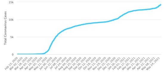 The last report published by the Ministry of Public Health dated 25 May 2021 reports 102 new cases and 2 new deaths in 24 hours (+ 9.6% compared to the previous day https://www.haitilibre.com/en/news-33845-haiti-flash-+388-of-cases-and-+-1-400-of-deaths-compared-to-april.html) or 14,453 confirmed cases and 311 deaths since the start of the pandemic. This brings the number of new cases to 1,283 and to 47 deaths for the first 25 days of May 2021 (latest data made available by the Ministry). Cases confirmed by department : West: 10.308 (+84 North: 897 (+7) Center: 766 (+2) Artibonite: 741 (+2) Northeast: 389 (unchanged) South-East: 330 (+4) South: 306 (unchanged) Northwest: 299 (unchanged) Grand'Anse: 250 (+1) Nippes: 167 (+2) Haiti : Cumulative cases since the start of the pandemic :