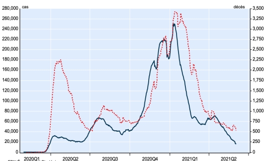 New cases in blue numbers on the left - New deaths in red numbers on the right Vaccination: 2.05 billion doses of vaccine injected (+30 million doses injected in 24 hours updated June 3, 2021 latest data available). TOP 5 countries with the most active cases: (less deaths and recoveries) 1st - USA: 5,524,788 cases, (-12,778 in 24 hours), the day before (+19,208) 2nd * - India: 1,555,229 cases (-80,747 in 24 hours), the day before (-77,413) 3rd * - Brazil: 1,131,294 cases (-26,589 in 24 hours), the day before (-20,660) 4th * - Argentina 369,849 cases (+3,712 in 24 hours), the day before (+5,290) 5th * - Iran: 350,794 cases (-4,741 in 24 hours), the day before (-7,985) TOP 5 countries with the most deaths: 1st - USA: 612,240 deaths (+629 in 24 hours), the day before (+591) 2nd * - Brazil: 470.968 deaths (+1.184 in 24 hours), the day before (+2.078) 3rd * - India: 344,101 deaths (+3,382 in 24 hours), the day before (+2,706) 4th * - Mexico: 228,568 deaths (+206 in 24 hours), the day before (+216) 5th * - Peru: 185,813 deaths (+433 in 24 hours), the day before (+438) TOP 5 countries with the highest number of healings: 1st - USA: 28,054,995 healings (+29,420 in 24 hours), cure rate 82.05% (+) 2nd * - India: 26,795,549 healings (+197,894 in 24 hours), cure rate 93.38% (+) 3rd * - Brazil: 15,239,692 healings (+ 10,709 in 24 hours), cure rate 90.48% (-) 4th * - France: 5,392,959 people (+14,589 in 24 hours), cure rate 94.59% (-) 5th * - Turkey: 5,147,610 people (+7,617 in 24 hours), cure rate 97.55% (+) DIASPORA: United States: * Case since the first case (March 9, 2020): 34,192,023 cases (+17,271 in 24 hours), the day before (+20,447) * Healings: 28,054,995 healings (+29,420 in 24 hours), the day before (+39,064) National Healing Rate: 82.05% (+) * Death: 612,240 deaths (+629 in 24 hours), the day before (+591) * Active cases (less deaths and recoveries): 5,524,788 cases, (-12,778 in 24 hours), the day before (+19,208) Canada: * Cases since the start of the epidemic (January 25, 2020): 1,389,508 cases (+2,063 in 24 hours), the day before (+2,167) * Healings: 1,337,254 people (+3,243 in 24 hours, the day before (+3,622) National Healing Rate: 96.23% (+) * Death: 25,679 deaths (+35 in 24 hours), the day before (+32) National death rate: 1.84% (=) * Active cases: (excluding death and recovery) 26.575 (-1.215 in 24 hours), the day before (-1.487) * Tests: (35,104,681) people tested since the first case. Vaccination: 24.93 million doses of vaccine injected since December 14, 2020, date of the first injection in Canada (+410,000 doses injected in 24 hours updated June 3, 2021 latest data available). Canada: Number of daily confirmed cases
