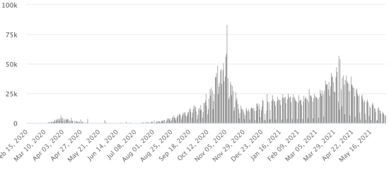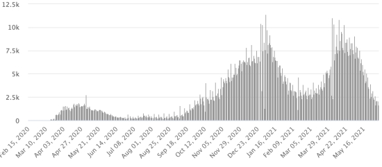 Vaccination: 299.12 million doses of vaccine injected since December 14, 2020, the date of the first injection in the United States (+1.4 million doses injected, in 24 hours). Updated 4 June 2021 last available data). New York State: * Cases since the start of the epidemic (March 1, 2020): 2,158,162 cases (+916 in 24 hours), the day before (+976) * Healings: 1,752,988 healings (+9,043 in 24 hours) the day before (+6,544) Healing rate: 81.22% (+) * Death: 53,715 deaths (+9 in 24 hours), the day before (+52) Death rate: 2.48% (=) * Active cases 351,459 cases (-8,136 in 24 hours), the day before (-5,620) * Tests: 56,505,239 people tested since the first case. New York State: Number of daily confirmed cases: