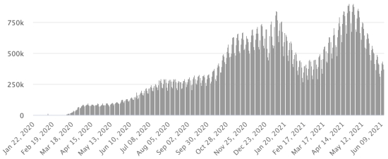 Vaccination: 2.26 billion doses of vaccine injected (+40 million doses injected in 24 hours updated June 9, 2021 latest data available). 1 TOP 5 countries with the most active cases: (less deaths and recoveries) 1st - USA: 5,319,295 cases, (-26,089 in 24 hours), the day before (-37,998) 2nd * - Brazil: 1,129,463 cases (+31,186 in 24 hours), the day before (+36,007) 3rd * - India: 1,026,136 cases (-54,538 in 24 hours), the day before (-40,979) 4th * - Argentina 330,784 cases (-9,006 in 24 hours), the day before (-3,023) 5th * - Iran: 298,330 cases (-8,150 in 24 hours), the 2,869 (-9,164 in 48 hours) TOP 5 countries with the most deaths: 1st - USA: 614,955 deaths (+217 in 24 hours), the day before (+731) 2nd * - Brazil: 486,358 deaths (+2,008 in 24 hours), the day before (+2,215) 3rd * - India: 370,407 deaths (+3,310 in 24 hours), the day before (+4,000) 4th * - Mexico: 230,095 deaths (+274 in 24 hours), the day before (+243) 5th * - Peru: 188,443 deaths (+343 in 24 hours), the day before (+253) TOP 5 countries with the highest number of healings: 1st - USA: 28,381,623 healings (+35,299 in 24 hours), cure rate 82.70% (+) 2nd * - India: 28,043,446 healings (+132,062 in 24 hours), cure rate 95.25% (+) 3rd * - Brazil: 15,761,177 healings (+42,584 in 24h), cure rate 90.70% (-) 4th * - France: 5,493,293 healings (+9,604 in 24 hours), cure rate 95.73% (+) 5th * - Turkey: 5,198,057 healings (+5,112 in 24 hours), cure rate 97.60% (-) DIASPORA: United States: * Case since the first case (March 9, 2020): 34,315,873 cases (+9,427 in 24 hours), the day before (+30,663) * Healings: 28,381,623 healings (+35,299 in 24h), the day before (+67,930) National Healing Rate: 82.70% (+) * Death: 614,955 deaths (+217 in 24 hours), the day before (+731) * Active cases (less deaths and recoveries): 5,319,295 cases, (-26,089 in 24 hours), the day before (-37,998) Canada: * Cases since the start of the epidemic (January 25, 2020): 1,401,006 cases (+1,290 in 24 hours), the day before (+ 1,441) * Healings: 1,357,493 people (+2,074 in 24 hours, the day before (+2,272) National Healing Rate: 96.89% (+) * Death: 25,914 deaths (+28 in 24 hours), the day before (+13) National death rate: 1.84% (=) * Active cases: (excluding death and cures) 17,599 (-812 in 24 hours), the day before (-844) * Tests: 35,639,265 people tested since the first case. Vaccination: 27.26 million doses of vaccine injected since December 14, 2020 date of the first injection in Canada (+400,000 doses injected in 24 hours updated June 9, 2021 latest data available). Canada: Number of daily confirmed cases