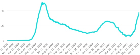 France: * Cases confirmed since the first case (January 24, 2020): 5,741,354 cases (+689 cases in 24 hours), the day before (+2,855) * Healings: 5,498,659 healings (+3,271 in 24h), the day before (+2,195) National Healing Rate: 95.77% (+) Deaths: 110,454 deaths (+63 in 24 hours in hospitals +0 in EMS / EHPAD), the day before in total, (+13) * Active cases: (excluding death and recovery) 132.241 (-2.516 in 24 hours), the day before (+647) Latin America and the Caribbean active cases (less deaths and recoveries): * Brazil: 1,112,193 cases (+19,779 in 24 hours), the day before (+25,090) * Argentina: 310,659 cases (-6,838 in 24 hours), the day before (-13,287) * Mexico: 268,590 cases (-1,186 in 24 hours), the day before (-216) * Colombia: 170,525 cases (-9,265 in 24 hours), the day before (+7,394) * Peru: 171,080 cases (unavailable since June 3), the day before (unavailable) Dominican Republic: 52,966 53,254 cases (-288 in 24 hours) the day before (-293) * Chile: 45,304 cases (-1,275 in 24 hours), the day before (-818) * Jamaica: 20,613 cases (-125 in 24 hours), the day before (-117) * Ecuador: 19,443 cases (+202 in 24 hours), the day before (+796) * French Guiana: 15,657 cases (+279 in 72h), the day before (unavailable) * Guadeloupe: 14,133 cases (unavailable 5th day), the day before (unavailable) * Martinique: 11,914 cases (unavailable 6th day), the day before (unavailable) * Panama: 9,533 cases (+119 in 24 hours), the day before (+323) * Cuba: 7,104 cases (+242 in 24 hours), the day before (+431) Haiti: 3,741 cases (+98 in 48h), previous (+346 in 48h) * Bahamas: 826 cases (+51 cases in 72h), the day before (unavailable) HAITI: Epidemiological situation: According to the Ministry of Public Health, 101 new cases in 24 hours of Covid-19 and its Alpha and Gamma variants were confirmed in Haiti on June 10, 2021 (latest data partial available) for a total of 16,662 cases confirmed throughout the national territory since the first case (March 19, 2020 https://www.haitilibre.com/en/news-30319-haiti-health-origin-of-the-first-2-cases-of-covid-19-in-haiti.html). Last update (355 in 48 hours on June 8 and 9, 2021). Haiti: Number of daily confirmed cases: