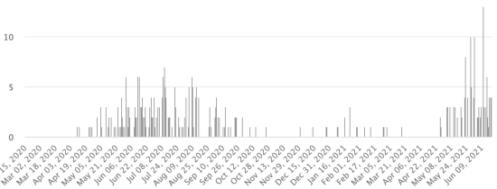 Vaccination: 2.62 billion doses of vaccine injected (+30 million doses injected in 24 hours updated June 19, 2021 latest data available). 1 TOP 5 countries with the most active cases: (less deaths and recoveries) 1st - USA: 5,089,786 cases, (-10,634 in 24 hours), the day before (-19,293) 2nd * - Brazil: 1,199,033 cases (+32,446 in 24 hours), the day before (+36,201) 3rd * - India: 729,216 cases (-30,773 in 24 hours), the day before (-38,636) 4th * - Russia 317,493 cases (+8,532 in 24 hours), the day before (+6,756) advance by one place 5th * - Argentina 301,547 cases (-8,640 in 24 hours), the day before (+6,078) TOP 5 countries with the most deaths: 1st - USA: 617,083 deaths (+163 in 24 hours), the day before (+480) 2nd * - Brazil: 500,868 deaths (+2,247 in 24 hours), the day before (+2,449) 3rd * - India: 386,740 deaths (+1,573 in 24 hours), the day before (+1,646) 4th * - Mexico: 231,151 deaths (+192 in 24 hours), the day before (+167) 5th * - Peru: 190,202 deaths (+269 in 24 hours), the day before (+176) TOP 5 countries with the highest number of healings: 1st * - India: 28,766,009 healings (+87,619 in 24 hours), cure rate 96.26% (+) 2nd - USA: 28,694,843 healings (+18,914 in 24 hours), cure rate 83.41% (+) 3rd * - Brazil: 16,183,849 healings (+46,881 in 24h), cure rate 90.49% (-) 4th * - France: 5,555,411 healings (+8,485 in 24 hours), cure rate 96.52% (+) 5th * - Turkey: 5,228,419 healings (+4,195 in 24 hours), cure rate 97.45% (-) DIASPORA: United States: * Case since the first case (March 9, 2020): 34,401,712 cases (+8,443 in 24 hours), the day before (+15,677) * Healings: 28,694,843 healings (+18,914 in 24 hours), the day before (+34,490) National Healing Rate: 83.41% (+) * Death: 617,083 deaths (+163 in 24 hours), the day before (+480) * Active cases (less deaths and recoveries): 5,089,786 cases, (-10,634 in 24 hours), the day before (-19,293) Canada: * Cases since the start of the epidemic (January 25, 2020): 1,408,123 cases (+854 in 24 hours), the day before (+1,016) * Healings: 1,369,844 people (+1,395 in 24 hours, the day before (+1,652) National Healing Rate: 97.28% (+) * Death: 26,054 deaths (+31 in 24 hours), the day before (+11) National death rate: 1.85% (-) * Active cases: (excluding death and cures) 12,225 (-572 in 24 hours), the day before (-647) * Tests: 36,104,847 people tested since the first case. Vaccination: 31.84 million doses of vaccine injected since December 14, 2020, date of the first injection in Canada (+420,000 doses injected in 24 hours updated June 19, 2021 latest data available). Canada: Number of daily confirmed active cases (less deaths and recoveries)