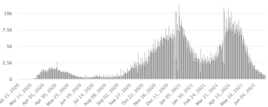 Vaccination: 2.92 billion doses of vaccine injected (+80 million doses injected in 48 hours updated June 26, 2021 latest data available). 1 TOP 5 countries with the most active cases: (less deaths and recoveries) 1st - USA: 4,957,885 cases, (-8,175 in 24 hours), the day before (-8,297) 2nd * - Brazil: 1,292,022 cases (+28,693 in 24 hours), the day before (+40,829) 3rd * - India: 586,374 cases (-9,160 in 24 hours), the day before (-17,306) 4th * - Russia 361,295 cases (+13,910 in 48 hours), the day before (unavailable) 5th * - Argentina 290,479 cases (+1,840 in 24 hours), the day before (+826) TOP 5 countries with the most deaths: 1st - USA: 619,343 deaths (+191 in 24 hours), the day before (+467) 2nd * - Brazil: 512,819 deaths (+1.547 in 24 hours), the day before (+1.990) 3rd * - India: 395,780 deaths (+1,256 in 24 hours), the day before (+1,186) 4th * - Mexico: 232,521 deaths (+175 in 24 hours), the day before (+278) 5th * - Peru: 191,584 deaths (+137 in 24 hours), the day before (+161) TOP 5 countries with the highest number of healings: 1st * - India: 29,251,029 healings (+57,944 in 24h), cure rate 96.75% (+) 2nd - USA: 28,912,906 healings (+15,446 in 24 hours), cure rate 83.82% (+) 3rd * - Brazil: 16,582,053 healings (+33,894 in 24h), cure rate 90.18% (-) 4th * - France: 5,601,814 healings (+5,037 in 24 hours), cure rate 97.14% (+) 5th * - Turkey: 5,269,294 healings (+7,402 in 24 hours), cure rate 97.50% (+) DIASPORA: United States: * Case since the first case (March 9, 2020): 34,490,134 cases (+7,462 in 24 hours), the day before (+17,716) * Healings: 28,912,906 healings (+15,446 in 24 hours), the day before (+25,546) National Healing Rate: 83.82% (+) * Death: 619,343 deaths (+191 in 24 hours), the day before (+467) * Active cases (less deaths and recoveries): 4,957,885 cases, (-8,175 in 24 hours), the day before (-8,297) Canada: * Cases since the start of the epidemic (January 25, 2020): 1,412,768 cases (+542 in 24 hours), the day before (+592) * Healings: 1,377,730 people (+826 in 24 hours, the day before (+810) National Healing Rate: 97.51% (+) * Death: 26,214 deaths (+17 in 24 hours), the day before (+6) National death rate: 1.85% (=) * Active cases: (excluding death and recovery) 8,824 (-301 in 24 hours), the day before ((-224) * Tests: 36,527,044 people tested since the first case. Vaccination: 35.14 million doses of vaccine injected since December 14, 2020, date of the first injection in Canada (+970,000 doses injected in 48 hours updated June 26, 2021 latest data available). Canada: Number of daily confirmed cases: