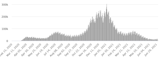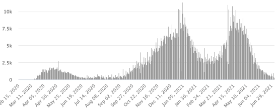 Vaccination: 3.22 billion doses of vaccine injected (+30 million doses injected in 24 hours updated July 4, 2021 latest data available). 1 TOP 5 countries with the most active cases: (less deaths and recoveries) 1st - USA: 4,874,268 cases, (-5,232 in 24 hours), the day before (-6,656) 2nd * - Brazil: 1,162,457 cases (-22,061 in 24 hours), the day before (+8,468) 3rd * - India: 482,041 cases (-3,299 in 24 hours), the day before (-8,468) 4th * - United Kingdom: 440,556 cases (+21,328 in 24 hours), the day before (+24,466) 5th * - Russia 413,274 cases (+9,159 in 48 hours), the day before (+14,838) TOP 5 countries with the most deaths: 1st - USA: 621,293 deaths (+38 in 24 hours), the day before (+94) 2nd * - Brazil: 524,475 deaths (+776 in 24 hours), the day before (+1,631) 3rd * - India: 402,758 deaths (+743 in 24 hours), the day before (+947) 4th * - Mexico: 233,622 deaths (+42 in 24 hours), the day before (+155) 5th * - Peru: 193,230 deaths (+161 in 48 hours), the day before (+167) TOP 5 countries with the highest number of healings: 1st * - India: 29,700,430 healings (+42,352 in 24 hours), cure rate 97.10% (+) 2nd - USA: 29,096,816 healings (+9,395 in 24 hours), cure rate 84.11% (+) 3rd * - Brazil: 17,082,876 healings (+49,068 in 24 hours), 91.01% cure rate (+) 4th * - France: 5,630,202 healings (+672 in 24 hours), cure rate 97.30% (-) 5th * - Turkey: 5,314,930 healings (+4,161 in 24 hours), cure rate 97.61% (=) DIASPORA: United States: * Case since the first case (March 9, 2020): 34,592,377 cases (+4,201 in 24 hours), the day before (+7,978) * Healings: 29,096,816 healings (+9,395 in 24 hours), the day before (+14,540) National Healing Rate: 84.11% (+) * Death: 621,293 deaths (+38 in 24 hours), the day before (+516) * Active cases (less deaths and recoveries): 4,874,268 cases, (-5,232 in 24 hours), the day before (-6,656) Canada: * Cases since the start of the epidemic (January 25, 2020): 1,416,969 cases (+308 in 24 hours), the day before (+344) * Healings: 1,384,448 people (+391 in 24 hours, the day before (+413) National Healing Rate: 97.70% (+) * Death: 26,360 deaths (+12 in 24 hours), the day before (+10) National death rate: 1.86% (=) * Active cases: (excluding death and recovery) 6,161 cases (-95 in 24 hours), the day before (-79) * Tests: 36,946,410 people tested since the first case. Vaccination: 39.1 million doses of vaccine injected since December 14, 2020, the date of the first injection in Canada (+320,000 million doses injected in 24 hours updated July 4, 2021 latest data available). Canada: Number of daily confirmed cases: