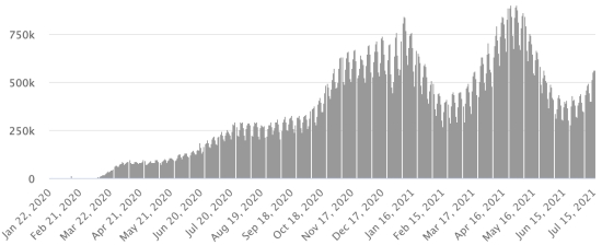 Vaccination: 336.6 million doses of vaccine injected since December 14, 2020, the date of the first injection in the United States (550,000 doses injected, in 24 hours). Update July 16, 2021 (latest available data). DOMINICAN REPUBLIC: Cases confirmed since March 1, 2020: 336,693 cases (+549 in 24 hours) the day before (+530). First case (1st March 2020) https://www.haitilibre.com/en/news-30165-haiti-flash-first-case-of-covid-19-in-the-dominican-republic.html Healings: 277,978 healings since March 1 (+552 in 24 hours), the day before (+583) National Healing Rate: 82.56% (+) Death: 3,910 deaths (+3 in 24 hours), the day before (+7) Mortality rate: 1.16% (=) Active cases: (excluding death and cures) 54,805 cases (-6 in 24 hours) the day before (-55 in 4 days) Dominican Republic: Number of daily confirmed cases: