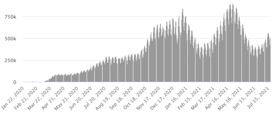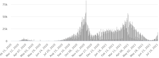 Most affected municipalities in the West (2021): Delmas: 1.795 (+12); Pétion ville 1,588 (+5); Port-au-Prince 985 (+2); Tabarre 773 (+7); Croix-des-Bouquets 715 (+4); Carrefour 361 (+0) Cases tested since the start of the pandemic: 95,866 cases (+267 in 24 hours, update July 11, 2021 (latest data available). Note that the very low number of people tested does not statistically allow us to do so. a representative estimate of Covid-19 cases in Haiti. Confirmed cases by department (2021): West: 6.753 (2020: 6.945) North: 426 (2020: 677) Center: 521 (2020: 508) Artibonite: 428 (2020: 593) Northeast: 229 (2020: 314) Southeast: 233 (2020: 274) South: 371 (2020: 262) Northwest: 141 (2020: 229) Grand'Anse: 301 (2020: 176) Nippes: 97 (2020: 149) Cumulative deaths by department (2021): West: 168 (2020: 104) North: 28 (2020: 34) Center: 15 (2020: 13) Artibonite: 10 (2020: 39) Northeast: 3 (2020: 6) South: 25 (2020: 6) Southeast: 7 (2020: 9) Northwest: 5 (2020: 12) Grand'Anse: 1 (2020: 13) Nippes: 10 (2020: 5) Distribution of deaths by age (2020 and 2021): 0-9 years: 12 10-19 years: 6 20-29 years: 20 30-39 years: 31 40-49 years: 55 50-59 years: 91 60-69 years: 107 70-79 years: 112 (+1) 80 years and over: 78 Vaccination: 38 doses injected on Friday, July 16 https://www.haitilibre.com/en/news-34253-haiti-covid-first-injections-of-vaccines.html . Last data available. DIASPORA: Epidemiological situation: USA: * Case since the first case (March 9, 2020): 35,081,719 cases (+63,119 in 24 hours), the day before (+54,693) * Healings: 29,435,171 healings (+28,969 in 24 hours), the day before (+29,612) National Healing Rate: 83.90% (-) * Death: 625,363 deaths (+380 in 24 hours), the day before (+237) National death rate: 1.78% (=) * Active cases (less deaths and recoveries): 5,021,185 cases, (+33,770 in 24 hours), the day before (+24,844) * Tests: 518,658,231 people tested since the first case. USA: Number of daily confirmed cases: