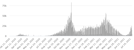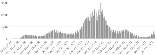 Most affected municipalities in the West (2021): Delmas: 1.818 (+5); Pétion ville 1,601 (+4); Port-au-Prince 1,005 (+3); Tabarre 785 (+2); Croix-des-Bouquets 736 (+8) Cases tested since the start of the pandemic: 98,546 cases (+440 in 24 hours update July 20, 2021 (latest data available). Note that the very low number of people tested does not statistically allow us to a representative estimate of Covid-19 cases in Haiti. Confirmed cases by department (2021): West: 6.878 (2020: 6.945) North: 433 (2020: 677) Center: 545 (2020: 508) Artibonite: 439 (2020: 593) Northeast: 250 (2020: 314) Southeast: 262 (2020: 274) South: 421 (2020: 262) Northwest: 141 (2020: 229) Grand'Anse: 315 (2020: 176) Nippes: 107 (2020: 149) Cumulative deaths by department (2021): West: 176 (2020: 104) North: 29 (2020: 34) Center: 19 (2020: 13) Artibonite: 12 (2020: 39) Northeast: 4 (2020: 6) South: 27 (2020: 6) Southeast: 8 (2020: 9) Northwest: 6 (2020: 12) Grand'Anse: 1 (2020: 13) Nippes: 12 (2020: 5) Distribution of deaths by age (2020 and 2021): 0-9 years: 13 (+1) 10-19 years: 6 20-29 years: 20 30-39 years: 32 40-49 years: 57 (+2) 50-59 years: 94 (+2) 60-69 years: 114 (+1) 70-79 years: 118 (+1) 80 years and over: 81 Vaccination: 3.379 doses of vaccine have been injected since July 16, 2021, date of the first injection https://www.haitilibre.com/en/news-34253-haiti-covid-first-injections-of-vaccines.html . Update July 26, 2021, latest data available. DIASPORA: Epidemiological situation: USA: * Case since the first case (March 9, 2020): 35,287,269 cases (+87,804 in 24 hours), the day before (+14,794) * Healings: 29,548,468 healings (+36,559 in 24 hours), the day before (+4,786) National Healing Rate: 83.73% (-) * Death: 627,039 deaths (+277 in 24 hours), the day before (+490) National death rate: 1.77% (-) * Active cases (less deaths and recoveries): 5,111,762 cases, (+50,968 in 24 hours), the day before (+9.959) * Tests: 525,983,886 people tested since the first case. USA: Number of daily confirmed cases: