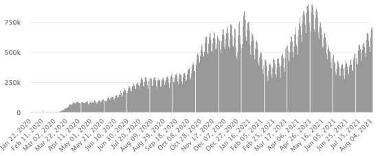 WORLD SITUATION: Epidemiological situation: Saturday, August 7, 2021 the number of people infected worldwide by the Covid-19 coronavirus since the start of the pandemic (Official source), amounts to 202,463,977 cases (+689,195 in 24 hours), the standby (+ 710,900) Number of contaminated countries: 192 * Healings: 181,954,994 people were cured of Covid-19 worldwide (+446,463 in 24 hours), the day before (+454,875) * Deaths: 4,290,958 people died of Covid-19 worldwide (+9,216 in 24 hours), the day before (+10,389) * Active cases (less deaths and recoveries) in the world is currently 16,218,025 cases (+233,516 in 24 hours), the day before (+245,636) Average cure rate in the world: 89.87% (-) Average death rate in the world: 2.11% (-) World: Number of daily confirmed cases: