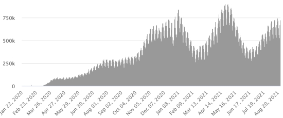 WORLD SITUATION: Epidemiological situation: Thursday, August 26, 2021 the number of people infected worldwide by the Covid-19 coronavirus since the start of the pandemic (Official source), amounts to 214,796,388 cases (+736,985 in 24 hours), the standby (+699,581) Number of contaminated countries: 192 * Healings: 192,119,933 people were cured of Covid-19 worldwide (+561,538 in 24 hours) the day before (+631,903) * Deaths: 4,477,495 people died from Covid-19 around the world (+10,762 in 24 hours), the day before (+12,293) * Active cases (less deaths and recoveries) in the world is currently 18,198,960 cases (+164,685 in 24 hours), the day before (+55,385) Average cure rate in the world: 89.44% (-) Average death rate in the world: 2.08% (=) World: Number of daily confirmed cases: