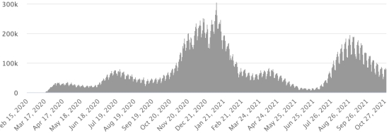 Vaccination: 419.02 million doses of vaccine injected since December 14, 2020, the date of the first injection in the United States (1.22 million doses injected, in 24 hours). Update 29 October 2021 (last available data).