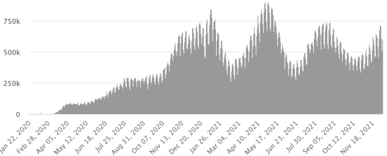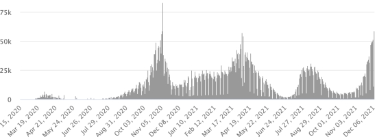 Test: 13,777,706 people tested since the first case (25,137 in 24 hours) Vaccination: 13,798,356 million doses of vaccine injected since December 16, 2020 date of the first injection (+20,776 in 24 hours), latest data available - MSSS as of December 7, 2021) FRANCE: * Cases confirmed since the first case (January 24, 2020): 7,987,591 cases (+59,019 cases in 24 hours), the day before (+11,308) * Healings: 7,211,231 healings (-192 correction), the day before (+40,043) National Healing Rate: 90.28% (-) Death: 119,899 deaths (+364 in 48 hours), the day before (not available) National death rate: 1.50% (=) * Active cases: (excluding death and cures) 656,461 (+58,847 in 24 hours), the day before (-28,735) France: Trend of active cases: (less healings and deaths)