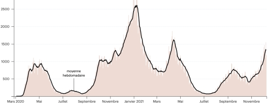 Test: 13,865,594 people tested since the first case (36,489 in 24 hours) Vaccination: 13,863,084 million doses of vaccine injected since December 16, 2020 date of the first injection (+33,799 in 24 hours), latest data available - MSSS dated December 9, 2021) FRANCE: * Cases confirmed since the first case (January 24, 2020): 8,105,785 cases (+ 56,854 cases in 24 hours), the day before (+ 61,340) * Healings: 7,252,376 healings (+20.951 in 24 hours), the day before (+20.194) National Healing Rate: 89.47% (-) Death: 120,168 deaths (+136 in 24 hours), the day before (+133) National death rate: 1.67% (+) * Active cases: (excluding death and cures) 733,241 (+35,767 in 24 hours), the day before (+41,013) France: Trend of active cases: (less healings and deaths)