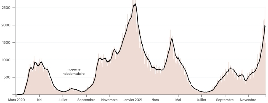 Test: 14,126,885 people tested since the first case (42,778 in 24 hours) Vaccination: 14,136,257 million doses of vaccine injected since December 14, 2020 date of the first injection (+52,143 in 24 hours), latest data available - MSSS dated December 16, 2021) FRANCE: * Cases confirmed since the first case (January 24, 2020): 8,460,712 cases (+60,866 cases in 24 hours), the day before (+65,713) * Healings: 7,430,011 healings (+34,248), the day before (+33,155) National Healing Rate: 87.81% (-) Death: 121,171 deaths (+188 in 24 hours), the day before (+151) National death rate: 1.43% (-) * Active cases: (excluding death and cures) 909,530 (+26,430 in 24 hours), the day before (+32,407) France: Number of daily confirmed cases: