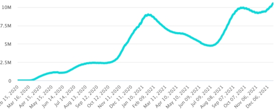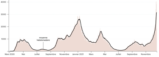 Test: 14,309,473 people tested since the first case (137,677 in 72 hours) Vaccination: 14,358.997 million doses of vaccine injected since December 14, 2020, date of the first injection (+164,233 in 72 hours), latest data available - MSSS dated December 20, 2021) FRANCE: * Cases confirmed since the first case (January 24, 2020): 8,640,924 cases (+15,075 cases in 24 hours), the day before (+48,473) * Healings: 7,553,787 healings (+46,878), the day before (+8,194) National Healing Rate: 87.41% (+) Deaths: 121,717 deaths (+224 in 24 hours), the day before (+75) National death rate: 1.40% (=) * Active cases: (excluding death and cures) 965,420 (-32,027 in 24 hours), the day before (+40,204) France: Trend of active cases: (less healings and deaths)