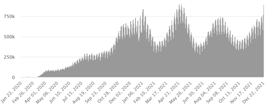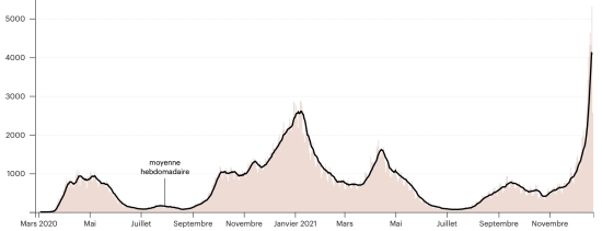 Test: 14,403,952, people tested since the first case (+50,526 in 24 hours) Vaccination: 14,523,777 million doses of vaccine injected since December 14, 2020, date of the first injection (+83,137 in 24 hours), latest data available - MSSS dated December 22, 2021) FRANCE: * Cases confirmed since the first case (January 24, 2020): 8,798,028 cases (+84,272 cases in 24 hours), the day before (+72,832) * Healings: 7,651,414 healings (+48,017), the day before (+49,610) National Healing Rate: 86.96% (-) Deaths: 122,116 deaths (+189) Death rate: 1.38% (=) Active cases : 988,413 (+22,993 in 24 hours), the day before (-22,993) France: Number of daily confirmed cases
