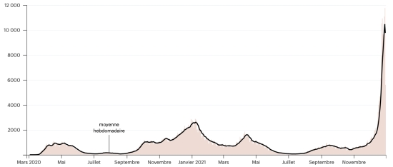 Test: 14,813,533 people tested since the first case (+53,990 in 24 hours) Vaccination: 14,995,780 million doses of vaccine injected since December 14, 2020, date of the first injection (+88,651 in 24 hours), latest data available - MSSS as of December 30, 2021) FRANCE: * Cases confirmed since the first case (January 24, 2020): 10,191,926 cases (+ 219,126 cases in 24 hours), the day before (+ 232,200) * Healings: 8,134,841 healings (+43,549), the day before (+53,540) National Healing Rate: 79.81% (-) Death: 123,851 deaths (+110), the day before (+189) Death rate: 1.21% (-) Active cases: 1,933,234 (+175,467 in 24 hours), the day before (+178,471) Test: 188,795,159 (last available data). France: Number of daily confirmed cases