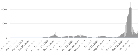 (Day-1) Vaccination: 11.05 billion doses of vaccine injected (+20 million doses injected in 24 hours. Updated March 13, 2022 (latest data available). HAITI: Epidemiological situation: According to the Ministry of Public Health, +15 new cases of Covid-19 and its variants have been confirmed in Haiti as of March 10, 2022 (latest partial data available ) for a total of 30,461 confirmed cases throughout the national territory (48.7% women and 51.3% men), since the first case (March 19, 2020 https://www.haitilibre.com/en/news-30319-haiti-health-origin-of-the-first-2-cases-of-covid-19-in-haiti.html ). Previous update (+8 cases as of March 9, 2022). Healings: 26,538 (+236) Cure rate: 87.12% (+) Deaths: 827 deaths (+0) () Death rate: 2.71% (=) 5th Wave (Omicron Dominant): Total of the 5th wave (starting December 27, 2021) 4,466 confirmed cases and 61 deaths Haiti: Active Cases Trend: (less recoveries and deaths)