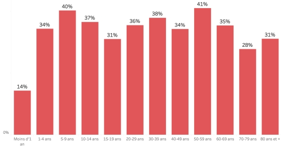 Distribution and deviations of suspected cases, total since October 3: Less than 1 year: + 587 (+5) 1-4 years: 6,366 cases (+74) 5-9 years: 4,683 cases (+38) 10-14 years old: 2,229 cases (+27) 15-19 years old: 1,633 cases (+11) 20-29 years old: 4,294 cases (+33) 30-39 years old: 3,784 cases (+29) 40-49 years old: 2,713 cases (+22) 50-59 years old: 2,042 cases (+23) 60-69 years old: 1,360 cases (+17) 70-79 years old: 736 cases (+8) 80 years and over: 98 cases cases (not available) ***Men: 55.81% men (=); Women 44.19% (=) Information not updated for 48 hours Positivity rate by age segment: