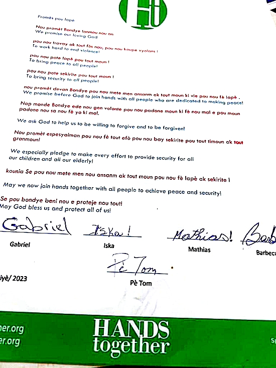 American Father Tom Hagan (81), founder of the charity organization Hands Together, told the Miami Herald newspaper that 5 gang leaders from Cité Soleil (Gabriel Jean-Pierre alias "Ti-Gabriel", Mathias Saintil of the gang coalition " G-Pèp", Iscard Andrice alias "Iska" and Jimmy Chérizier alias "Barbecue" of the gang coalition "G-9 An Fanmi", jointly signed a bilingual truce document (Creole English)... Hagan, has been in contact for several weeks with gang leaders to try to broker a deal. "He had them sign the document that puts God at the center and asks the leaders to make every effort to ensure the safety of all our children and all our elders". However, this "truce" where God is at the center must be put into perspective, these gang leaders who write "We promise our loving God to work hard to end the violence and bring peace [...]" careful not to say explicitly that they will stop shooting, but that they are more in favor of Peace and forgiveness, specifies Father Hagan.
