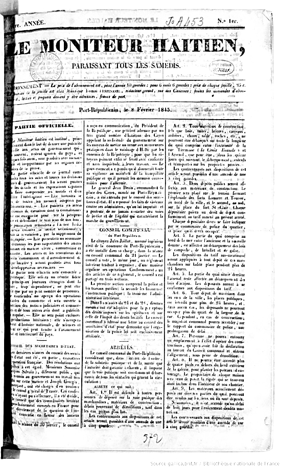 Women and girls targeted by gangs 458 women and 28 girls were killed, 353 women and 15 girls injured while 689 women and 11 girls were kidnapped between January 1 and November 15, 2023, as part of incidents linked to armed gangs in Haiti. However, Marie Goretti Nduwayo, the representative of UN-Women in Haiti, is alarmed and emphasizes that these figures are partial and do not reflect reality because the situation is much more serious... Our Grenadières historical world ranking In the latest FIFA women's rankings published on Friday December 15, 2023, our Grenadières moved up 1 place and found themselves 51st in the world with 1,502.91 points (+15.94 pts) just ahead of South Africa and behind Paraguay. Note that this is the Grenadières’ best ranking in their history. Consulate of Colombia, official opening Friday, December 15, 2023, in the presence of Haitian Chancellor Jean Victor Généus and the Colombian Minister of Foreign Relations, Álvaro Leyvaentre, ambassadors Daniel Cámara Alvalos (Mexico), Fabrice Mauriès (France), André François Giroux (Canada), Fritz Deshomme Rector of the UEH and other personalities from civil society and the private sector, the official opening ceremony of the Consulate of the Republic of Colombia in Juvenat took place, after 20 years of absence of diplomatic mission in Haiti. Regional Finance Summit Cap-Haïtien will host the Regional Finance Summit from December 14 to 16, 2023, organized by Group Croissance. This Friday, December 15, the BRH will share perspectives on the economy, microfinance, digital currency and financial inclusion. Did you know ? The national presses of Haiti and the newspaper Le Moniteur were merged in 1983. These entities are classified among the oldest public institutions in the country. The Monitor is published in two separate issues. Laws, decrees and orders are published in a special issue while trademarks, limited companies and other notices appear in a regular issue. The first issue of the official newspaper Le Moniteur was published on February 8, 1845.