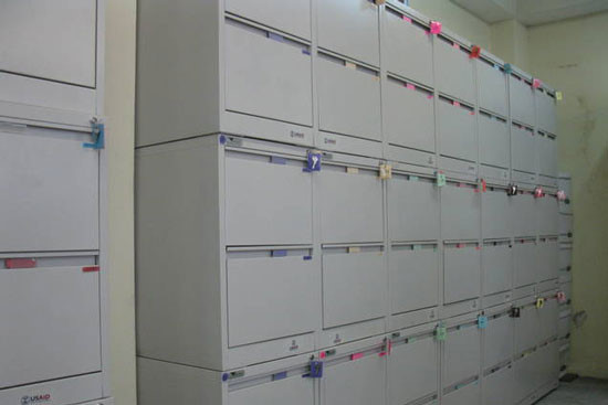 Gathered in bulk, legal files and records of state-civil of department of the West taken from the ruins of the Palace of Justice of Port-au-Prince, during the earthquake of January 2010, had been transported in a wet room and stored on wooden shelves chewed by termites... Given the importance of these documents, the Section of Human Rights (SDH) of the Minustah, the Office of the High Commissioner for Human Rights (OHCHR), launched the project "Reconstruction of the archives of the Palace of Justice" of an initial period of 3 months. The recruitment of an expert in records management, namely the archivist Carline Lanoue and six employees, allows to start the project which consists to "Strengthen the criminal justice system by improving access to records, more particularly records management." This involves the classification of records (decisions of criminal courts and correctional, orders of magistrates, acts of civil status, divorces and adoptions, etc...) of the Registry of Palace of Justice and their inventory. First observation of the archivist, "When arriving the Palace of Justice we found all these documents and records tangled. The files were damaged and all piled into a room that did not meet the standards of a archival repository." Conservators are responsible for repair and change the covers of books, to make them identifiable by the colors assigned to the different sections of the state-civil. Work is progressing and in the archive room, many documents have already been sorted and classified either in boxes or in drawers. This is a provisional classification where each box is codified, it bears in this way the code of the court and the judge. A color is assigned to each judge who also has his drawer on which it can find its color and code.