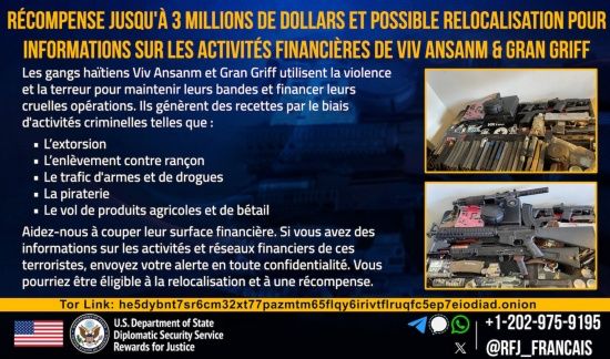 More information about this reward offer is located on the Rewards for Justice website at www.rewardsforjustice.net. We encourage anyone with information on Viv Ansanm and Gran Grif to contact Rewards for Justice via Signal, Whatsapp, or Telegram at +1-202-702-7843. All information will be kept strictly confidential. Since its inception in 1984, the program has paid more than $250 million to more than 125 people across the globe who provided actionable information that had helped resolve threats to U.S. national security. HL/ HaitiLibre