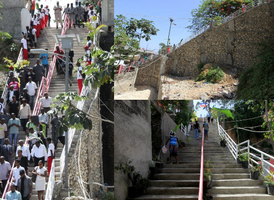 Friday, the President Martelly visited Jalouzi (Petion ville) accompanied by the engineer Jacques Gabriel, the Minister of Public Works; of the engineer Philippe Cinéas, State Secretary of Public Works; of Me Gregory Mayard Paul, egal Advisor to the President; of Delegate Louis Gonzaga Day and Ms. Claire Lydie, the Mayor of Petion-Ville, to inquire about the progress of work in this area. Speaking to the population the President Martelly declared "[...] I came here to see the progress of the stairs [leading to Jalouzi] and I want to commend the Public Works who did the work: 71 steps, six levels where people can relax, 14 meters high ! We had the time to identify this morning, in the bottom left of the stairs, we will build a covered area where people can play, right we will build a big wall and we will make a basketball court for Youth [...] I would like to give you more than that, what you deserve [...] but you know, there is much to do.... this is what makes, that in two, three neighborhoods, there are two or three things that are made. [...] While we're here, we'll visit the Centre Professionnel Municipal of Petion-Ville. They told me also that the kidergarden has problems and will close this year, I visited it and I will do the necessary to include it in my program so that it does not close, and that all children continue to attend school [...]