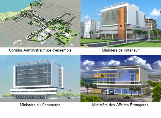 The cost of construction of the Ministry of Foreign Affairs, is estimated at $17.5 million (Funding: PetroCaribe-Treasury), and will create 150 jobs. The building is under construction, difficulties were encountered in excavations (organic matter and rainfall), beginning of backfilling, end of work is scheduled for March 2014. The cost of construction of Palace of Finance (MEF, AGD, DGI), is estimated at $40 million (Funding: IMF debt relief). Plans are underway, the start of construction is scheduled for June 2013 and the end of December 2014. The cost of construction of Parliament, is estimated at 33-34 million, depending on the option chosen (Financing: Debt Relief IMF) and will create 275 jobs. Plans are completed, pending parliamentary approval, the end of work is scheduled for January 2015.